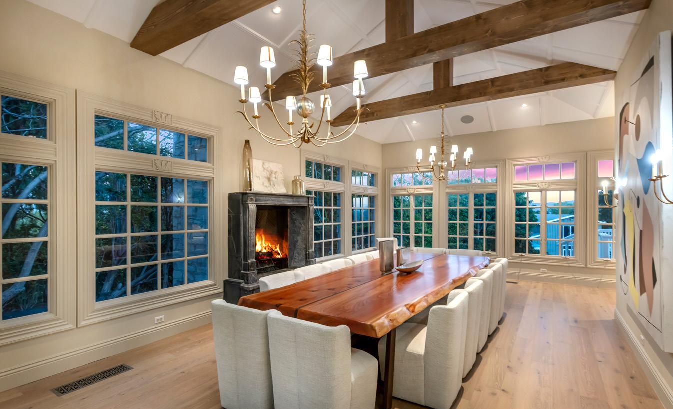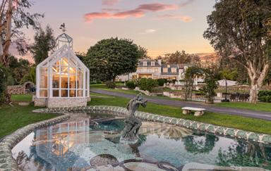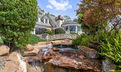 Renowned as one of the most exquisite custom residences in Orange County, this Hamptons-esque estate in the scenic coastal hills of San Juan Capistrano now showcases a brand-new $3,500,000 renovation that calls to mind the grandeur of classic Beverly Hills and European mansions from a bygone era. Originally constructed over seven years, the stately manor retains its sophisticated architectural style while incorporating on-trend appointments with top-tier finishes. Crowning an elevated home site of 3.83 acres just four miles from the ocean, the estate welcomes panoramic countryside views that stretch across surrounding hills, valleys and shimmering evening lights. Impressive entry gates open to reveal a long driveway with porte-cochere, covered front porch, custom fountain and marble statues that adorn the lush landscaping that compliments the elegant exterior clad in Burgundy French limestone. First impressions are stunning, with a towering twostory foyer complemented by a floating circular staircase, dome ceiling with skylight, imported chandelier, and illuminated art alcoves. Entertain formally in a living room with Artisan slate floors, an abundance of windows and French doors, and an elaborate ceiling with intricately carved beams. The private dining room accommodates large and small gatherings and offers windows on three sides, vaulted beam ceilings and imported stone fireplace.