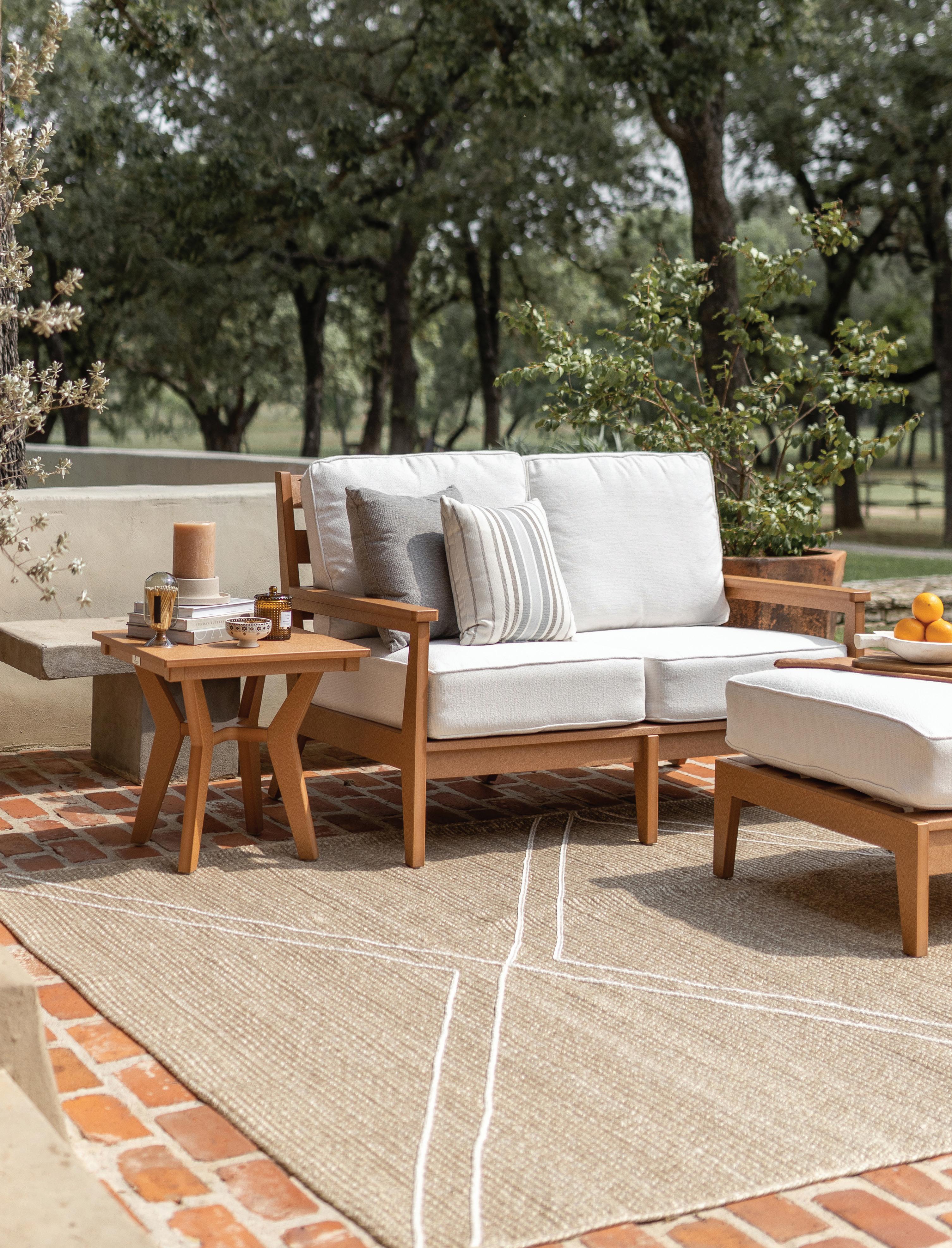 — The Yoder Family(Shown on cover): FRONT: Classic Terrace Sofa and 38" Conversation Table in Brazilian Walnut. Cushions in Rumba Canvas and throw pillows in Comfort Clay, Nurture Clay, and Nurture White. | BACK: Mayhew Loveseat and Ottoman in Cedar with cushions in Nurture White.