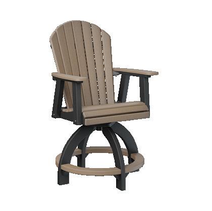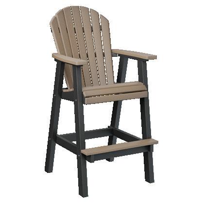 That classic Adirondack look with comfort you don't expect. You’ll notice the difference of our contoured, higher back.LEFT: Comfo Back Chaise Lounges and Round End Table (dining height) in Antique Mahogany. Seat cushions in Nantucket Linen and lumbar pillows in Rumba Canvas. Umbrella in Blend Linen. | ABOVE: Comfo Back Adirondack Chairs in Antique Mahogany on Weatherwood with Adirondack Chair Tete-a-Tete in Antique Mahogany.