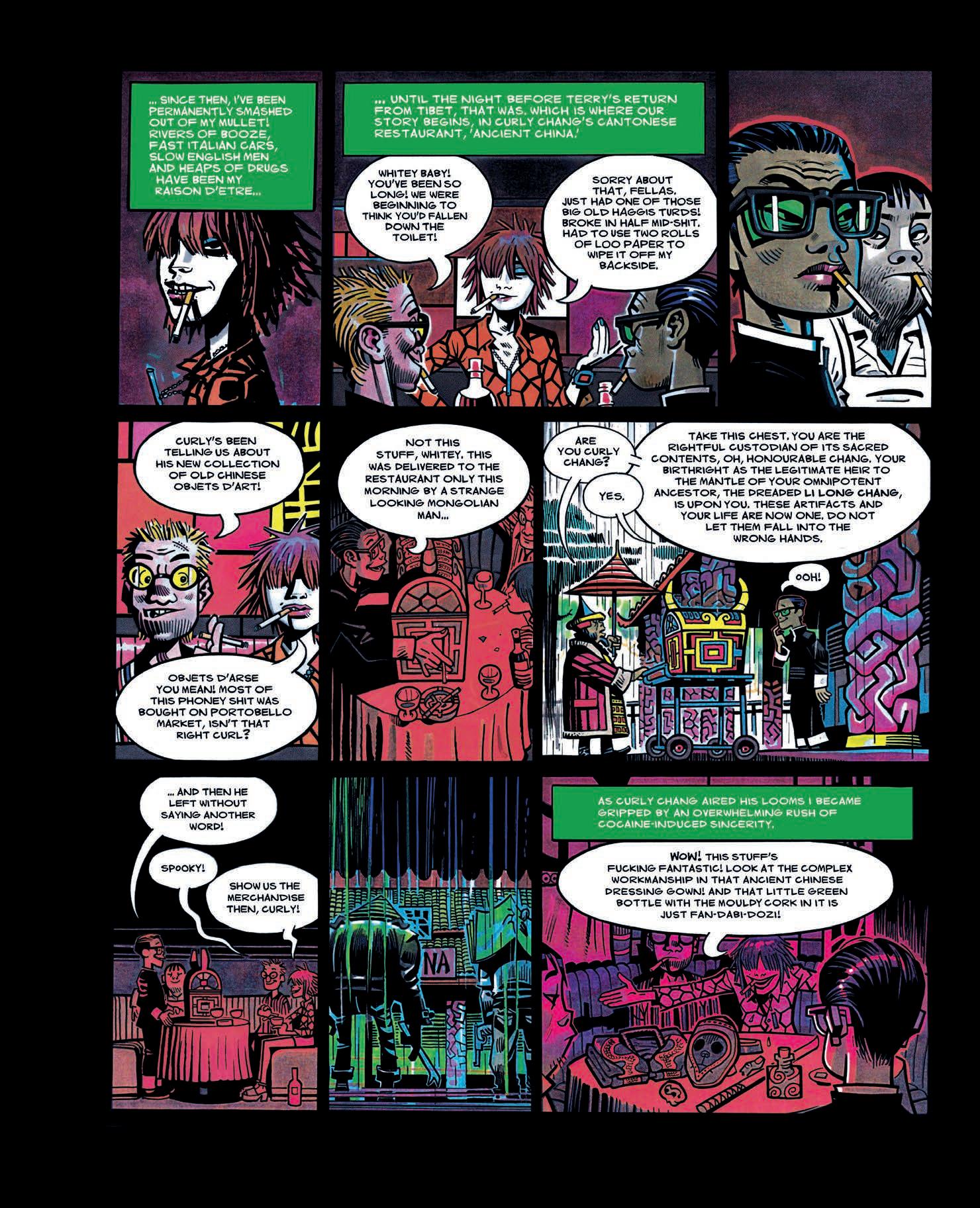 No one has spotted the two crash-helmeted spectators in the doorway. Li Long Chang knows he’s discovered the generals needed to set his Banquet of Evil in motion, and amid the aftermath he removes his skid-lid and steps out of the darkness, offering the gang power beyond their imaginations, utterly beguiling in all his menace and splendour. Cyril and his mutants really cannot believe that yet another dicklicker is going to try and interrupt them. Piping up through his Tesco’s gimp mask. “Take over the world? You and what army?” In direct answer, Li Long reanimates the corpses of the fallen Scotsmen. The gang of superfreaks are in.