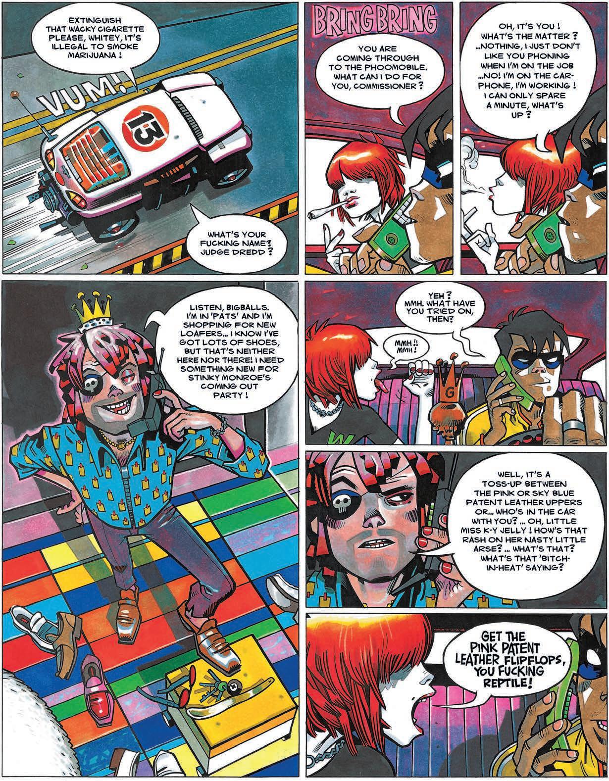 such as Peter Milligan and Brendan McCarthy’s psychedelic, postmodern celebrity superhero strip Paradax, which mixed the epic and the everyday to stunning effect. And, as was so often the case in Jamie’s first decade, we feel the powerful influence of Mike McMahon, one of the chief progenitors of Judge Dredd, specifically the acute sense of design and chiaroscuro colour he displayed on his 1991 masterpiece The Last American. That Whitey Action could be the rave generation Mini the Minx is a theory I also personally adhere to. Mix all of the above with a dash of Libatore's Ranxerox world of ultra-violence, narcotics, dubious erotica, and provocations and you have the incendiary Get the Freebies formula.