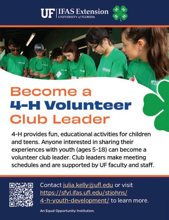 4-H is a youth development program that enables youth to develop life skills, leadership and citizenship. . Youth members ages 5-18, as of September 1st, 2024 interested in joining a 4-H Club can enroll in the St. Johns County 4-H program ONLINE on August 1st by going to www.florida.4honline.com . Please contact the 4-H Office at 904 2090430 for more information. The St. Johns County 4-H Program is an equal opportunity institution.