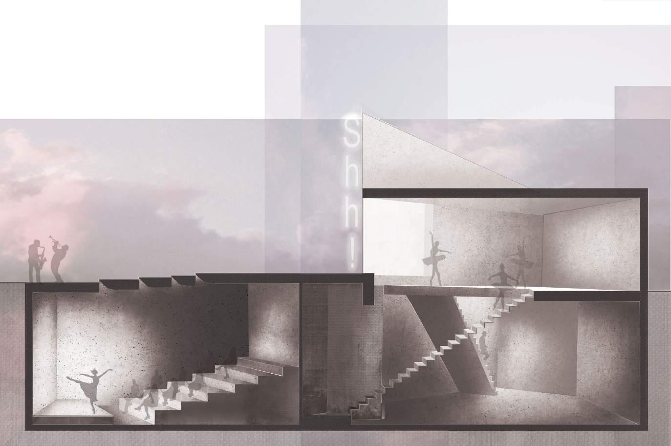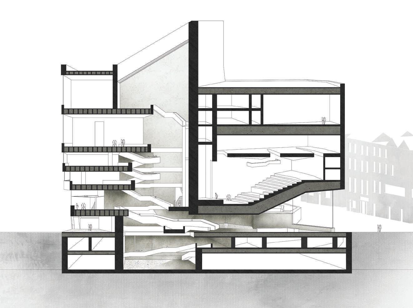 The circulation zone of my building has a participatory element too. Visitors have views towards all zones, and the staircase is designed to allow people to pause and observe their surroundings.