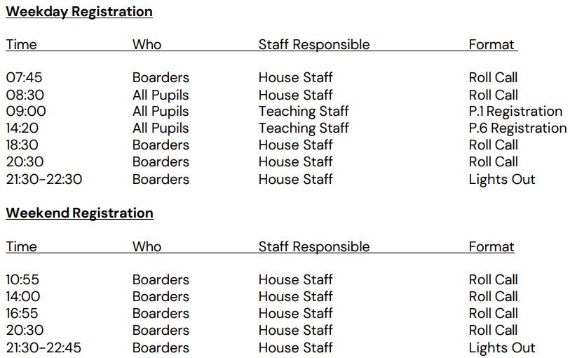 5:30pm Roll Call in Houses Meet your Boarding Buddy Fire Alarm and Assembly procedure