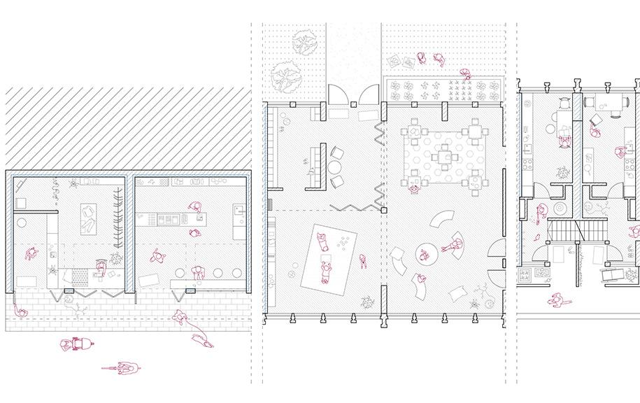 The ground floor apartments are transformed into community services. They become a place for meetings, neighbourly integration, exchange of experiences and passions. Moreover, responding to the reationship in the structure (street-courtyard).