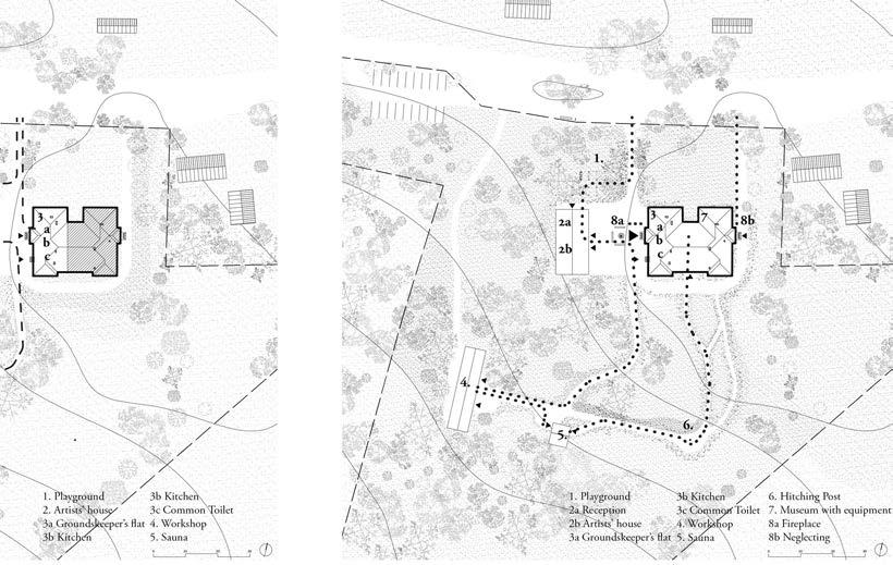 The building of the former school from 1976, with an area of 785 m2, is to become a museum that will educate visitors about nature and the history of horses. The area of 2.37 hectares will also offer guest houses, apartments and workplaces for resident artists. The project should be open-ended and consider the development of the facility, starting with a place for temporary art workshops, through a house for resident artists, to a museum with a permanent exhibition and a guesthouse.