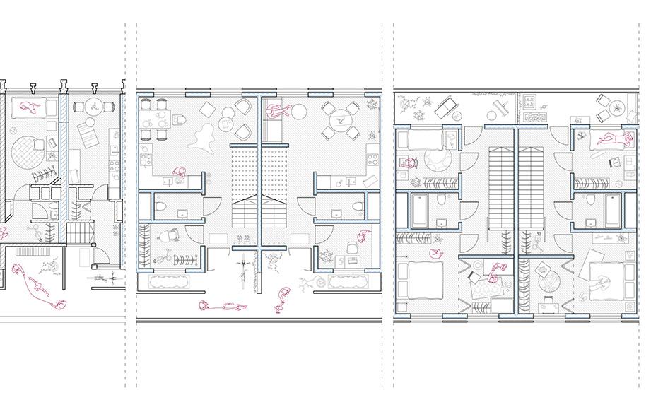 The renovation is based on The Pattern Language, written by Cristopher Alexander, which is adaptive for social housing estates as the issues are universal. The patterns focus on the problem, not on a single dwelling. The strategies taken on the estates consist of solutions on different scales.