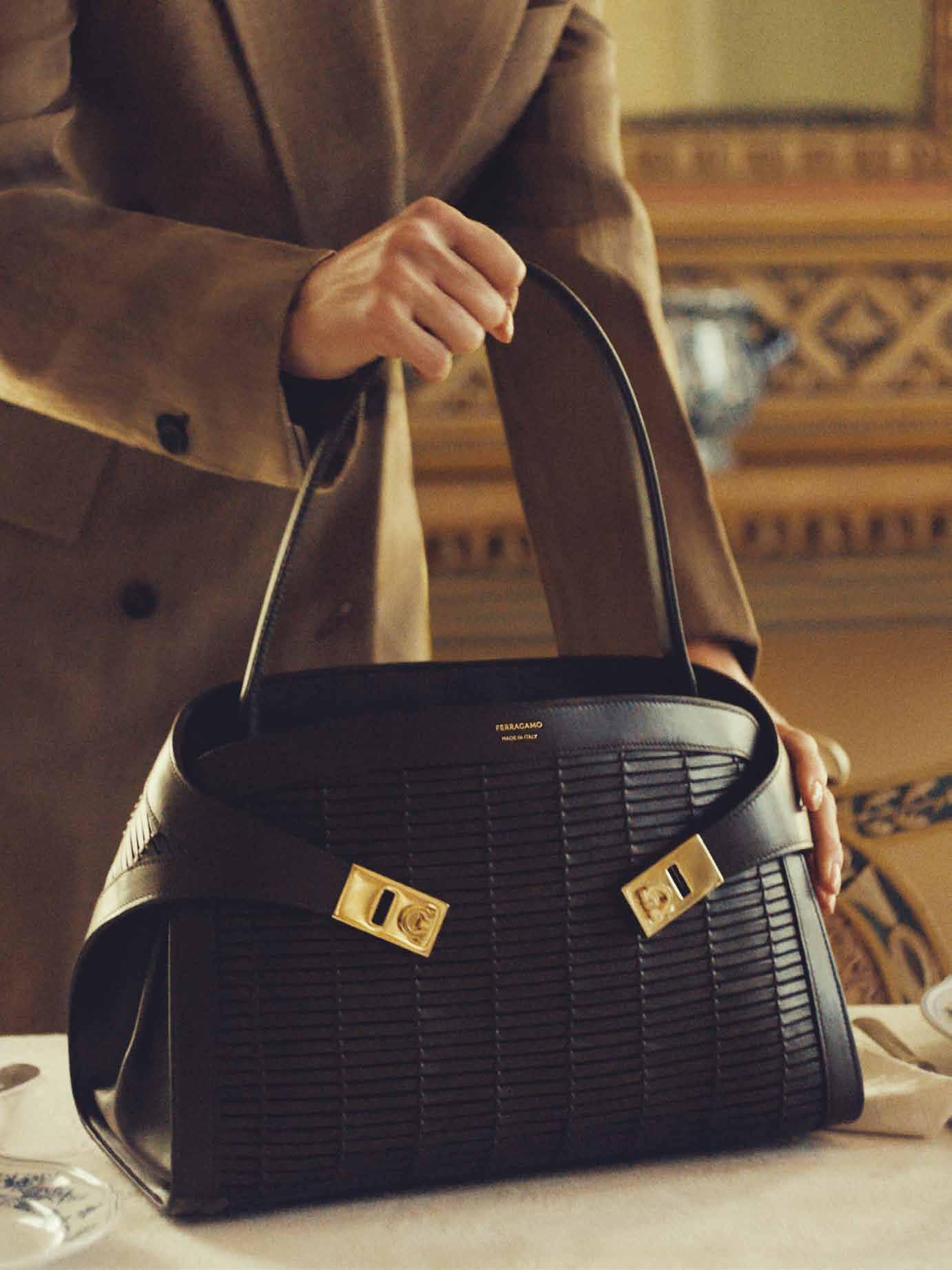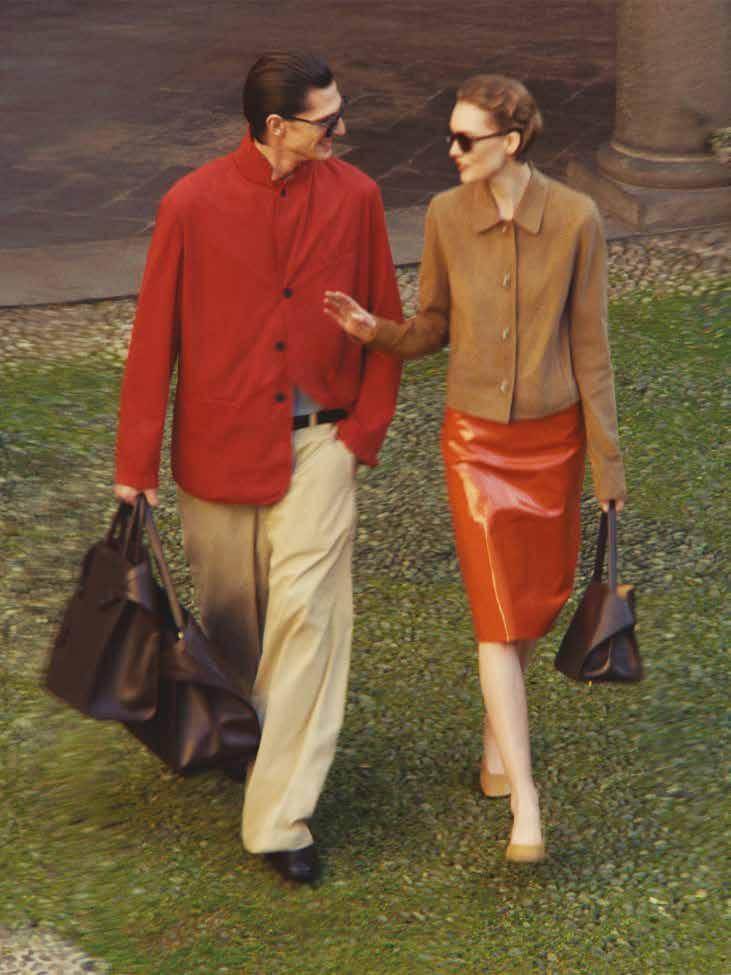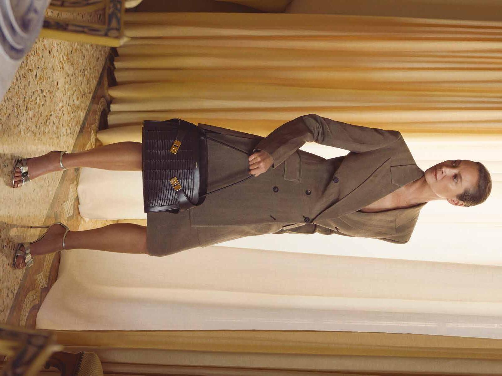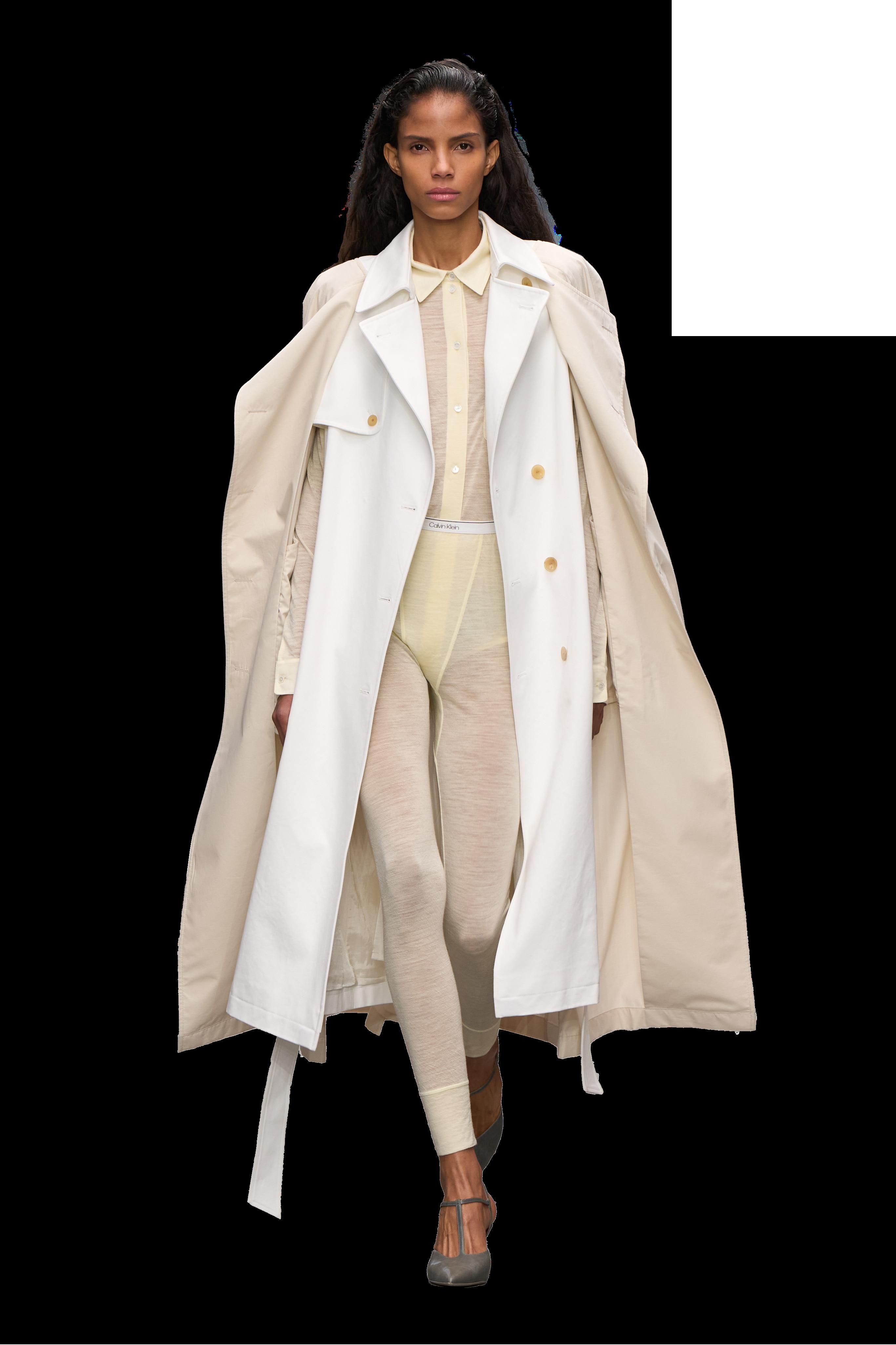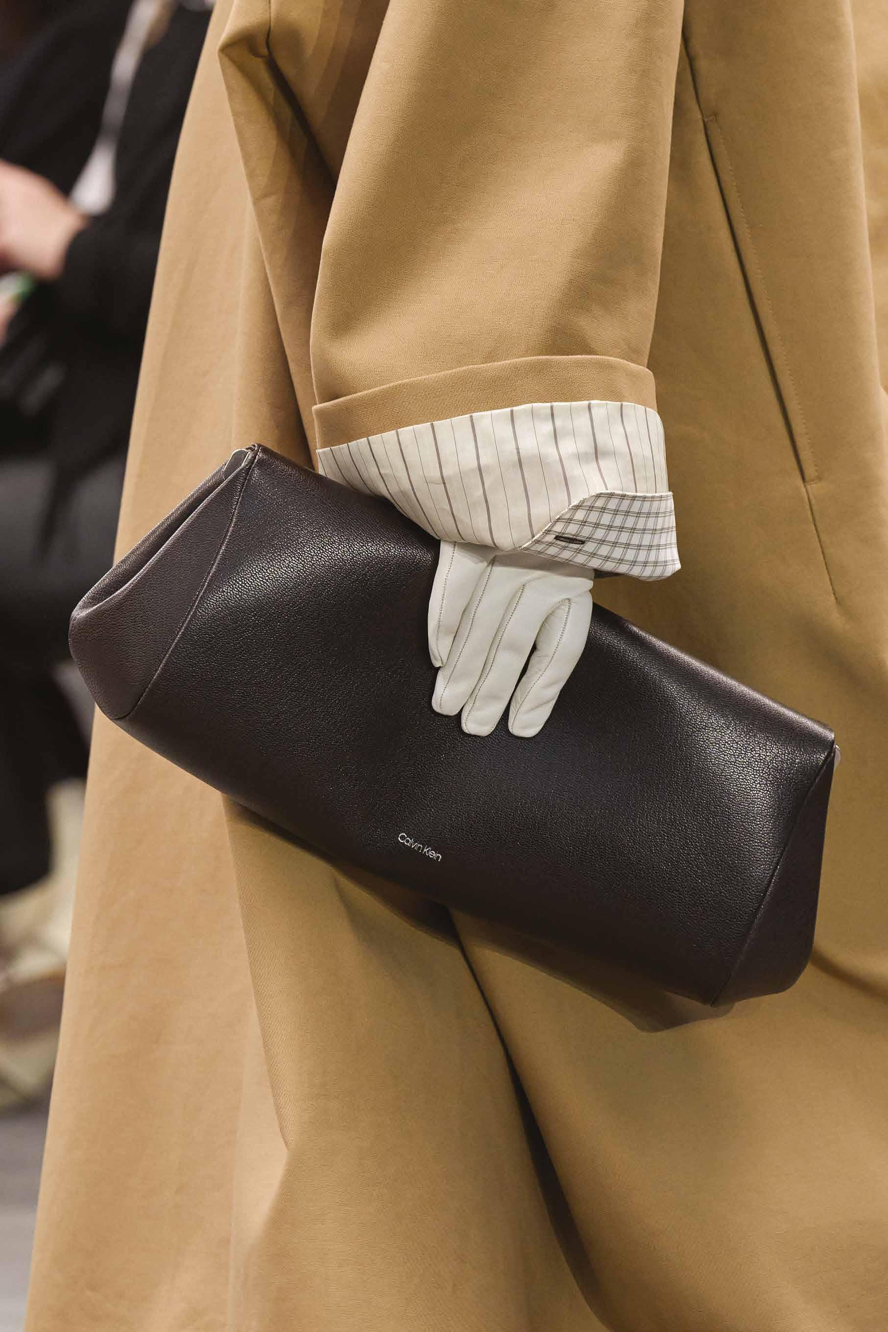 La expresión de e Collection otoño 2026 se transmite a través de piezas esenciales: trajes sastre, trench coats, blusones, abrigos y vestidos combinados con stilettos, ats, botas, clutches y bolsos tipo du e, además de guantes en tonos monocromáticos. El denim cobra protagonismo mediante una reinterpretación del archivo de 1976, el primero presentado en la pasarela de Calvin Klein: un traje completo de denim llevado bajo abrigos de silueta esbelta, y el logotipo original escrito a mano bordado en una chaqueta aviador y en un trench coat a cuadros.