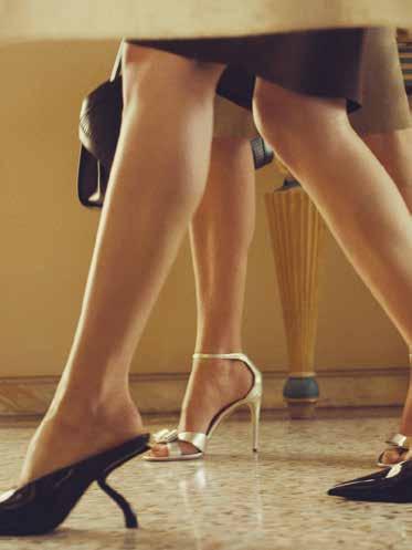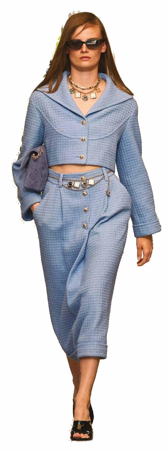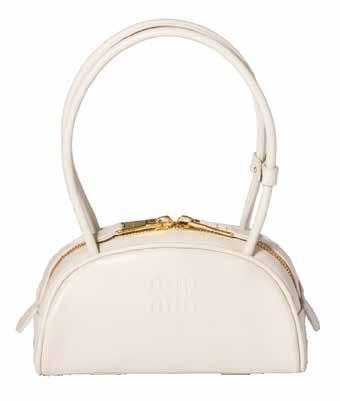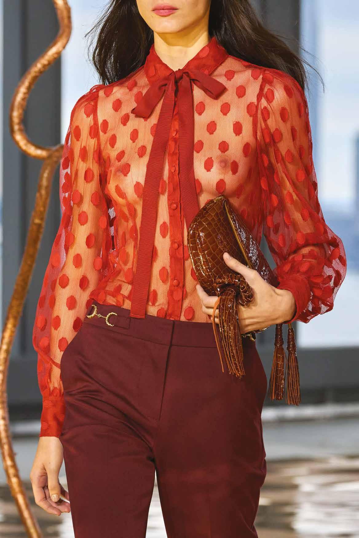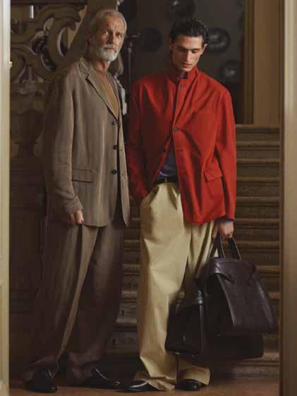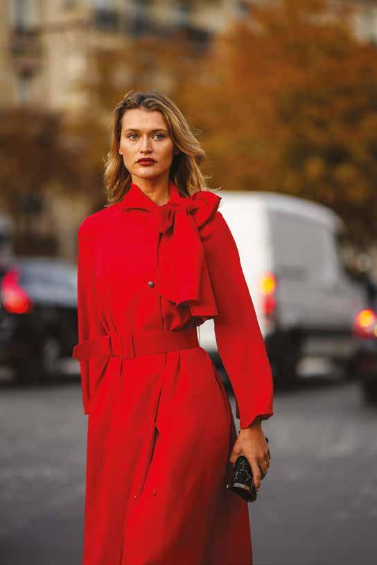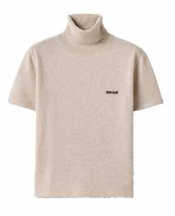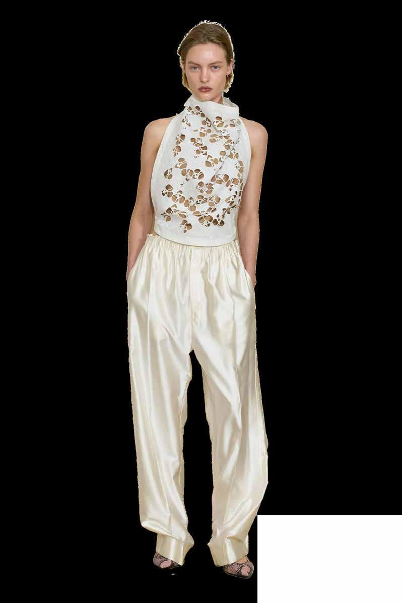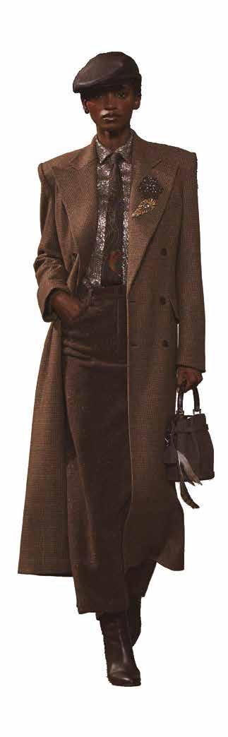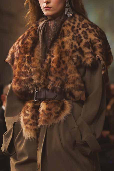 Cuellos blancos emergen con protagonismo, mientras que los cuellos tipo biker aportan un toque rudo, y los cuellos de shearling sugieren grandeza antes de expandirse en un abrigo completo de shearling. La textura y el color de nen una escena urbana de tonos neutros y matices sobrios, ocasionalmente iluminados con destellos de tangerina o burdeos. Los tejidos abarcan desde lanas de sastrería de acabado seco hasta jersey acanalado, terciopelo uido, satén laminado, algodones, grosgrains y spazzolato, así como cueros opacos y transparentes.