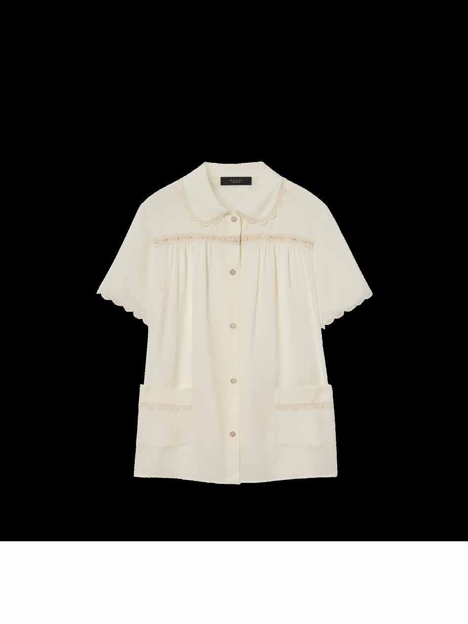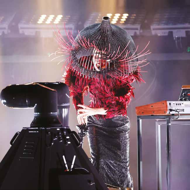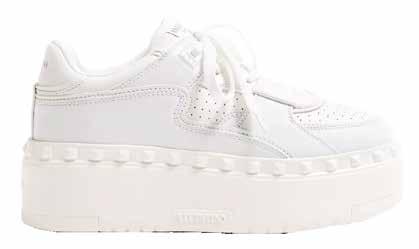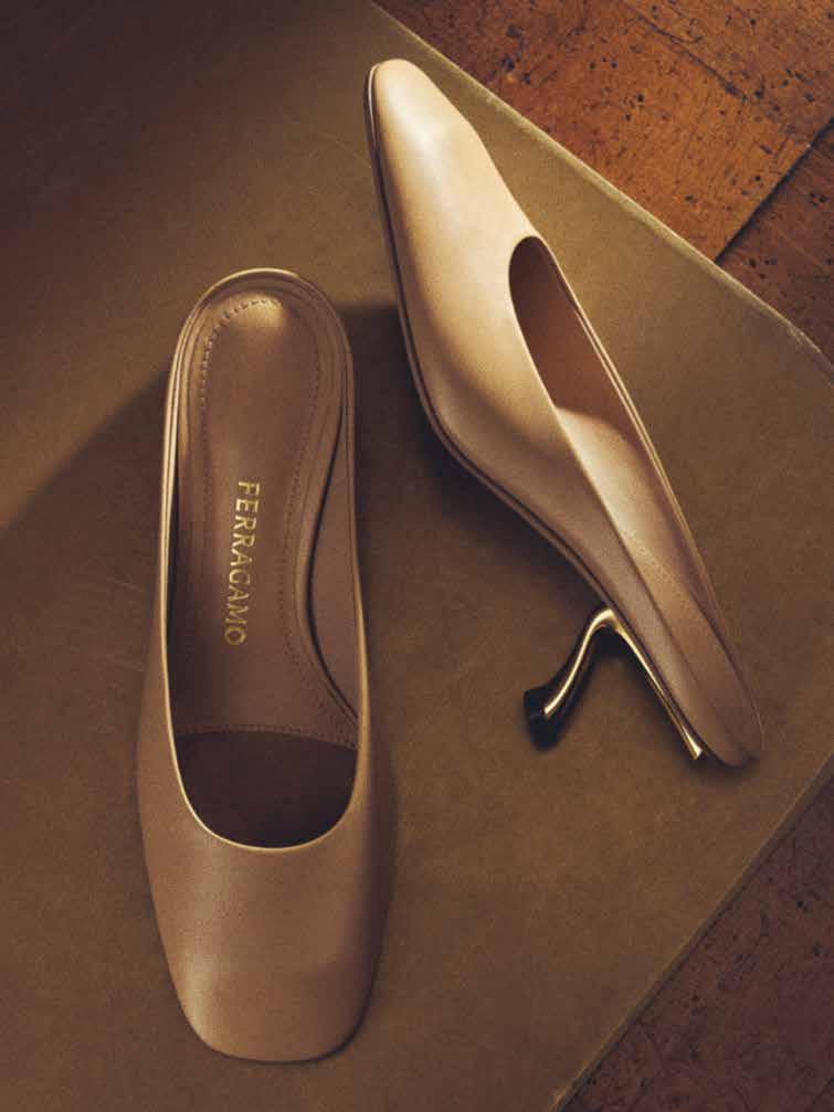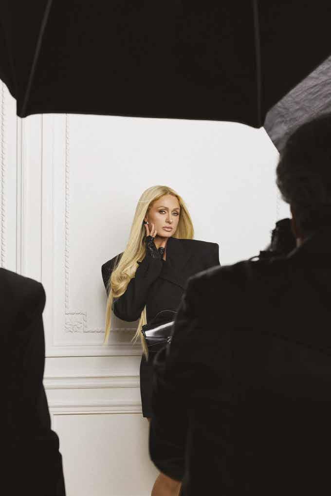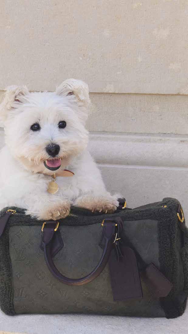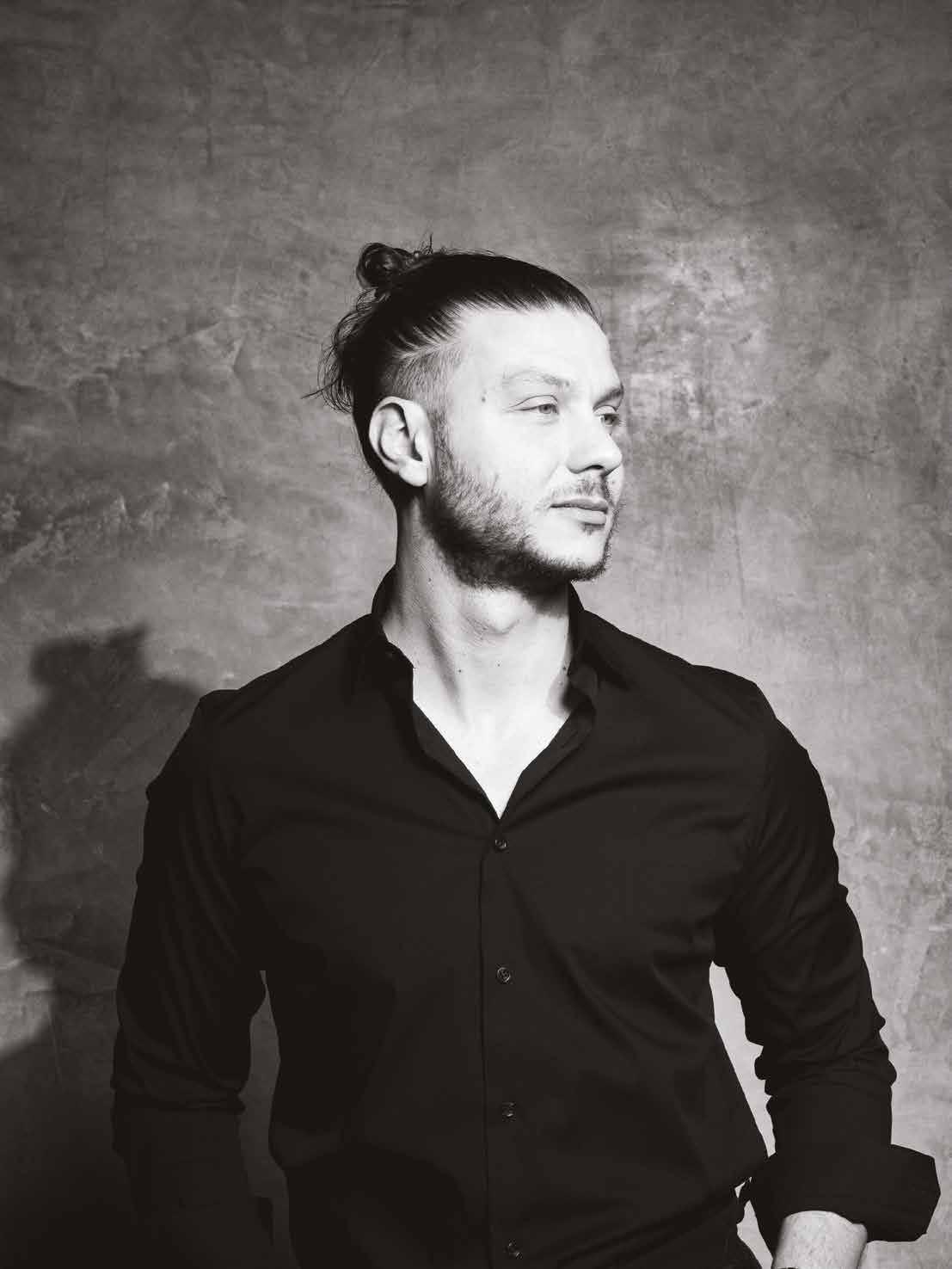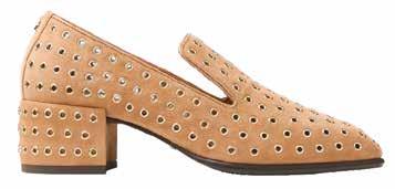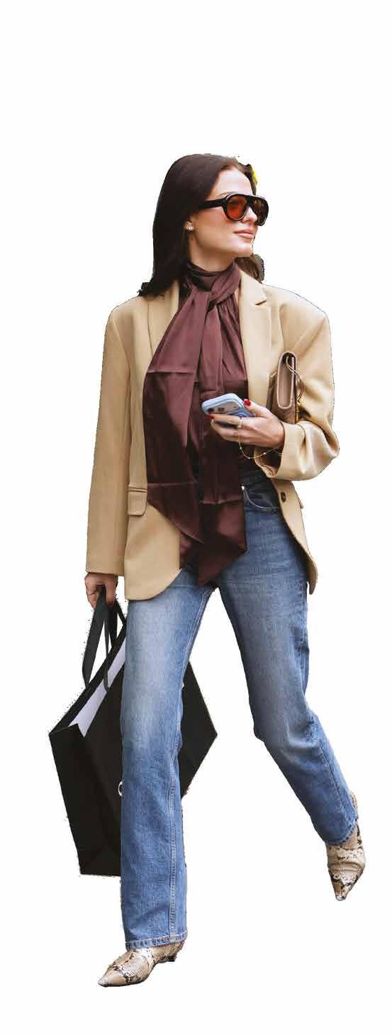 Cuellos blancos emergen con protagonismo, mientras que los cuellos tipo biker aportan un toque rudo, y los cuellos de shearling sugieren grandeza antes de expandirse en un abrigo completo de shearling. La textura y el color de nen una escena urbana de tonos neutros y matices sobrios, ocasionalmente iluminados con destellos de tangerina o burdeos. Los tejidos abarcan desde lanas de sastrería de acabado seco hasta jersey acanalado, terciopelo uido, satén laminado, algodones, grosgrains y spazzolato, así como cueros opacos y transparentes.