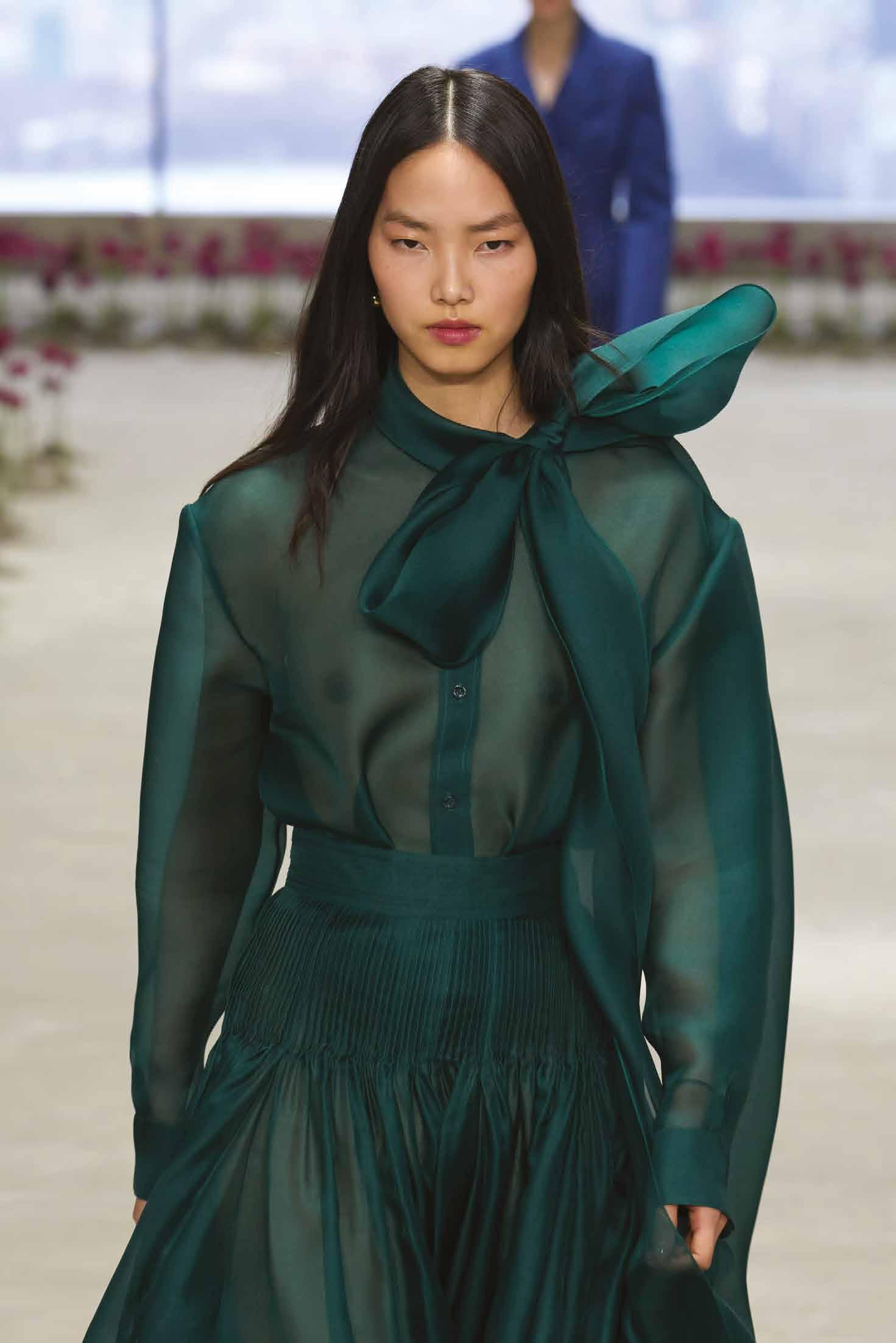 A lo largo de los distintos estilos, la silueta es alta y recta; la sastrería precisa y ajustada, con inesperadas espaldas descubiertas y detalles sin mangas, crea tensión, mientras que los vestidos intensamente trabajados presentan espaldas lisas en contraste que revelan su estructura interna.