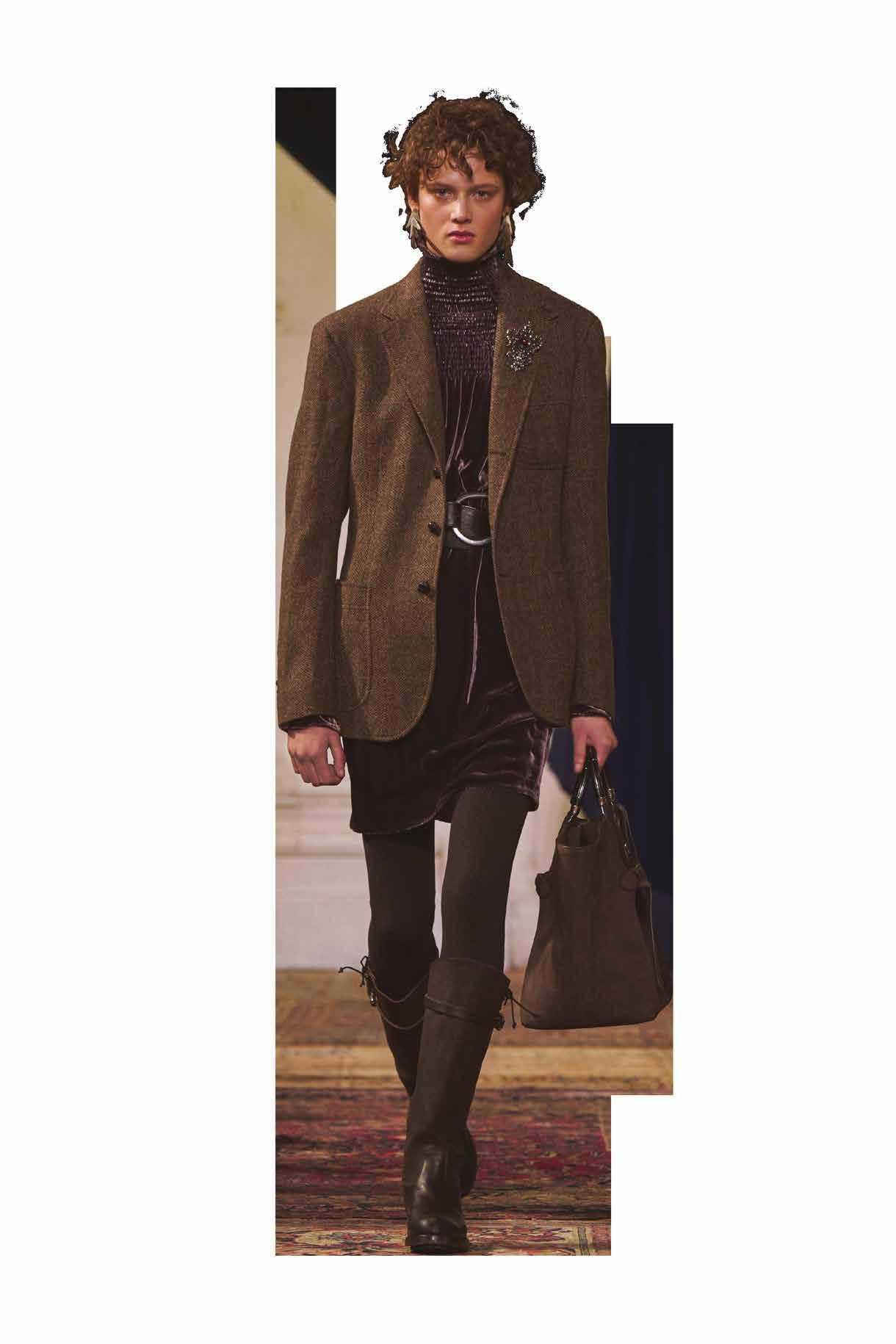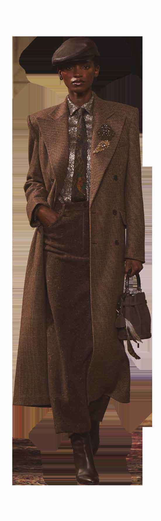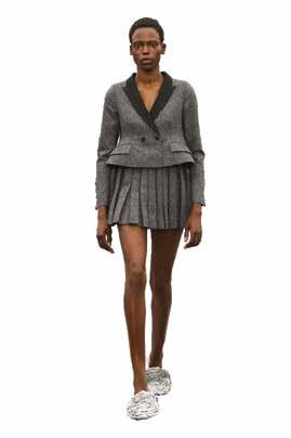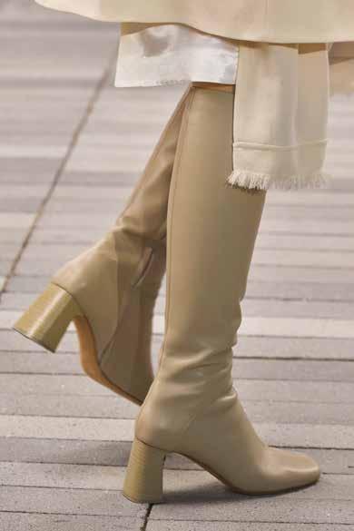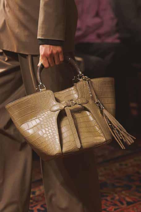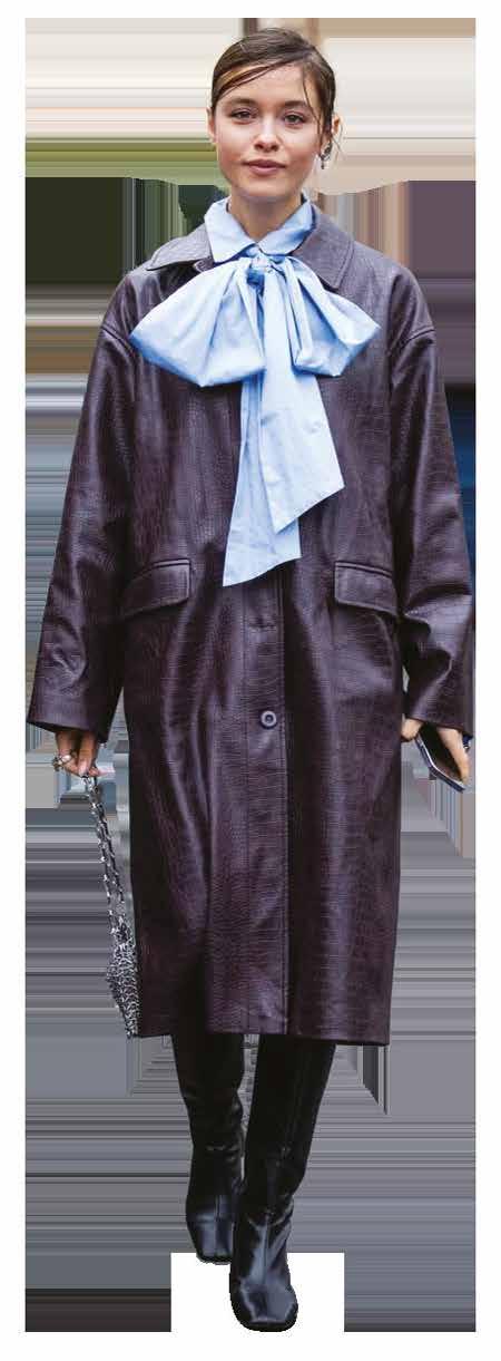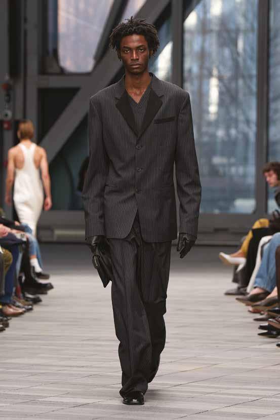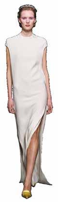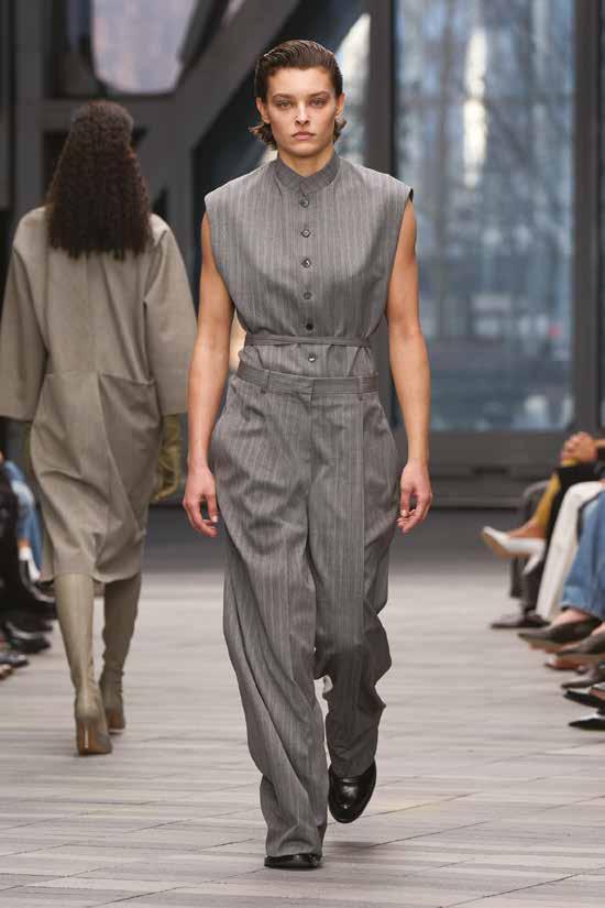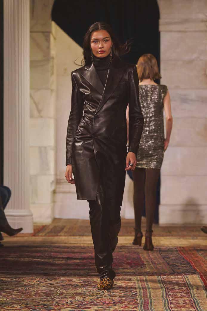 Cuellos blancos emergen con protagonismo, mientras que los cuellos tipo biker aportan un toque rudo, y los cuellos de shearling sugieren grandeza antes de expandirse en un abrigo completo de shearling. La textura y el color de nen una escena urbana de tonos neutros y matices sobrios, ocasionalmente iluminados con destellos de tangerina o burdeos. Los tejidos abarcan desde lanas de sastrería de acabado seco hasta jersey acanalado, terciopelo uido, satén laminado, algodones, grosgrains y spazzolato, así como cueros opacos y transparentes.