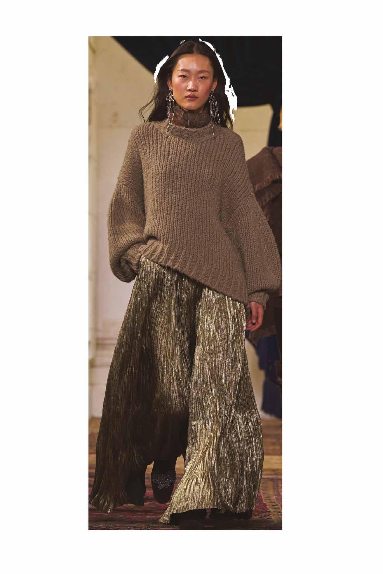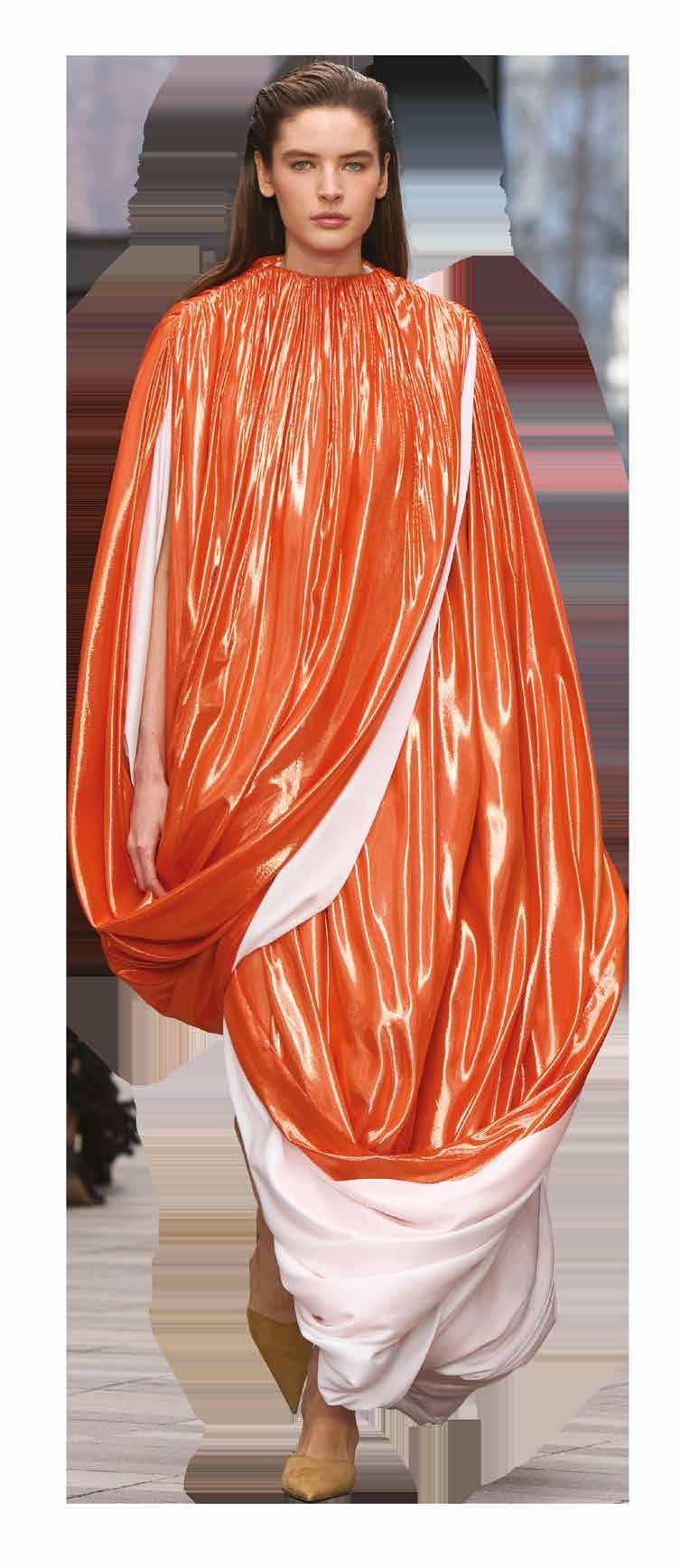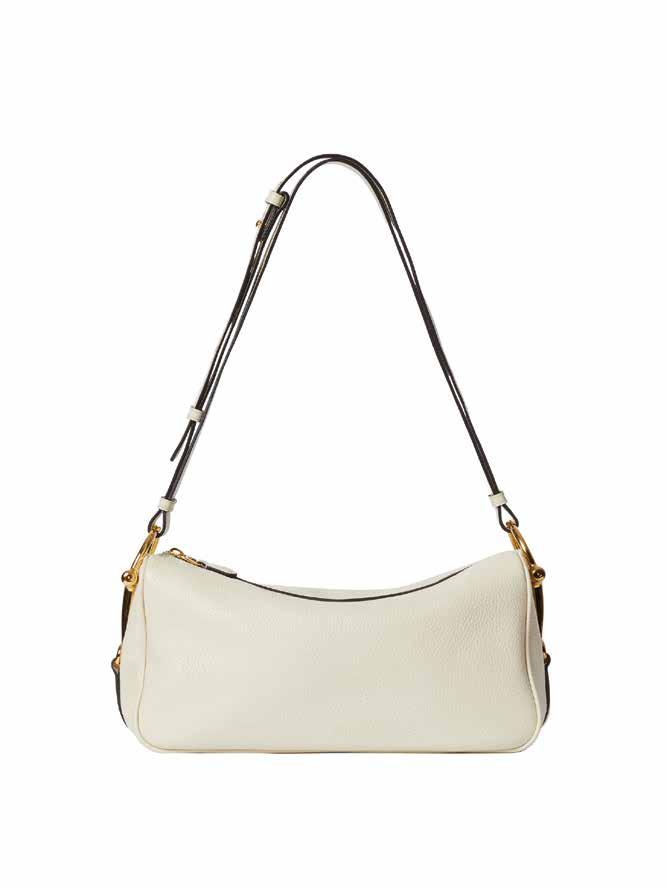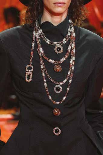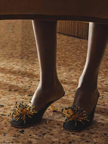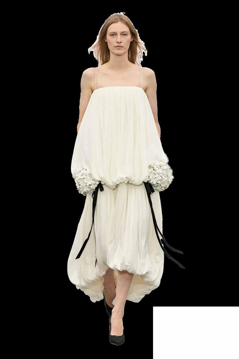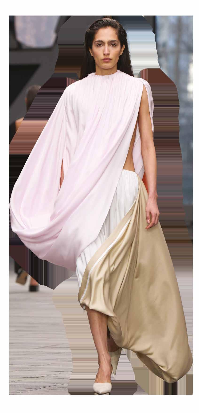 Cuellos blancos emergen con protagonismo, mientras que los cuellos tipo biker aportan un toque rudo, y los cuellos de shearling sugieren grandeza antes de expandirse en un abrigo completo de shearling. La textura y el color de nen una escena urbana de tonos neutros y matices sobrios, ocasionalmente iluminados con destellos de tangerina o burdeos. Los tejidos abarcan desde lanas de sastrería de acabado seco hasta jersey acanalado, terciopelo uido, satén laminado, algodones, grosgrains y spazzolato, así como cueros opacos y transparentes.