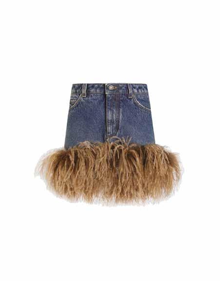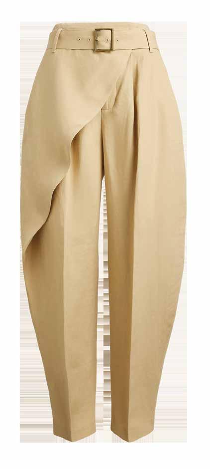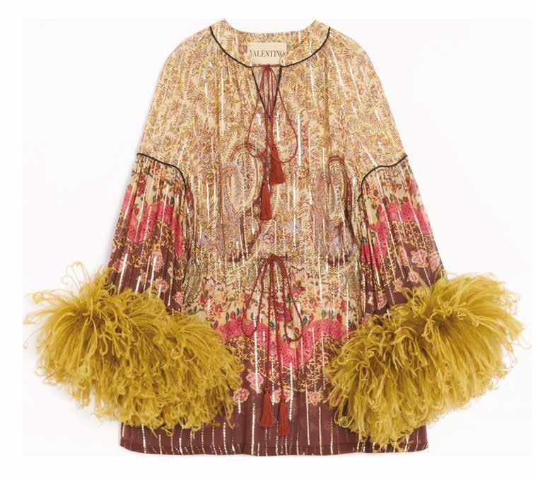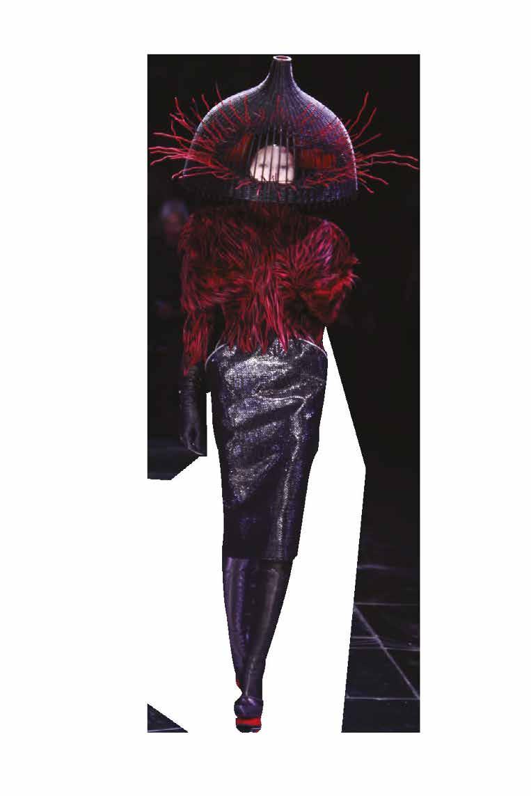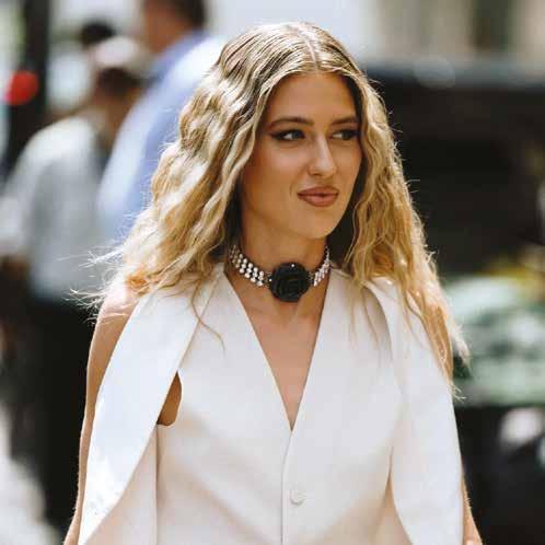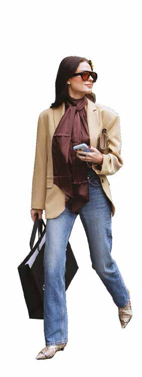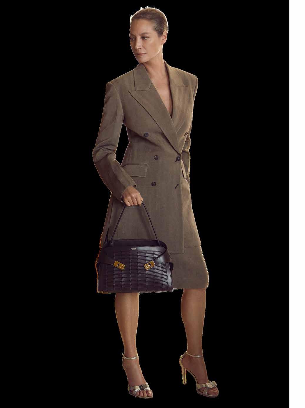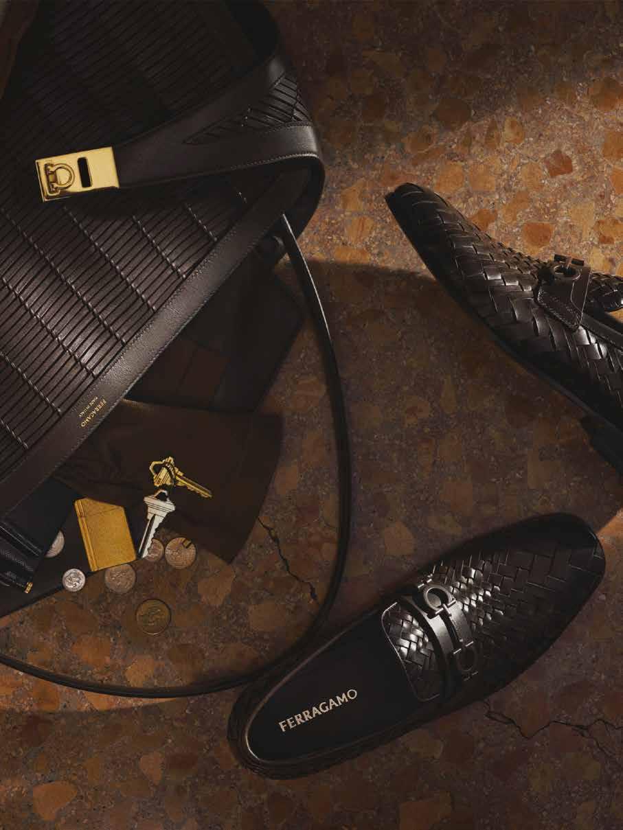 Cuellos blancos emergen con protagonismo, mientras que los cuellos tipo biker aportan un toque rudo, y los cuellos de shearling sugieren grandeza antes de expandirse en un abrigo completo de shearling. La textura y el color de nen una escena urbana de tonos neutros y matices sobrios, ocasionalmente iluminados con destellos de tangerina o burdeos. Los tejidos abarcan desde lanas de sastrería de acabado seco hasta jersey acanalado, terciopelo uido, satén laminado, algodones, grosgrains y spazzolato, así como cueros opacos y transparentes.