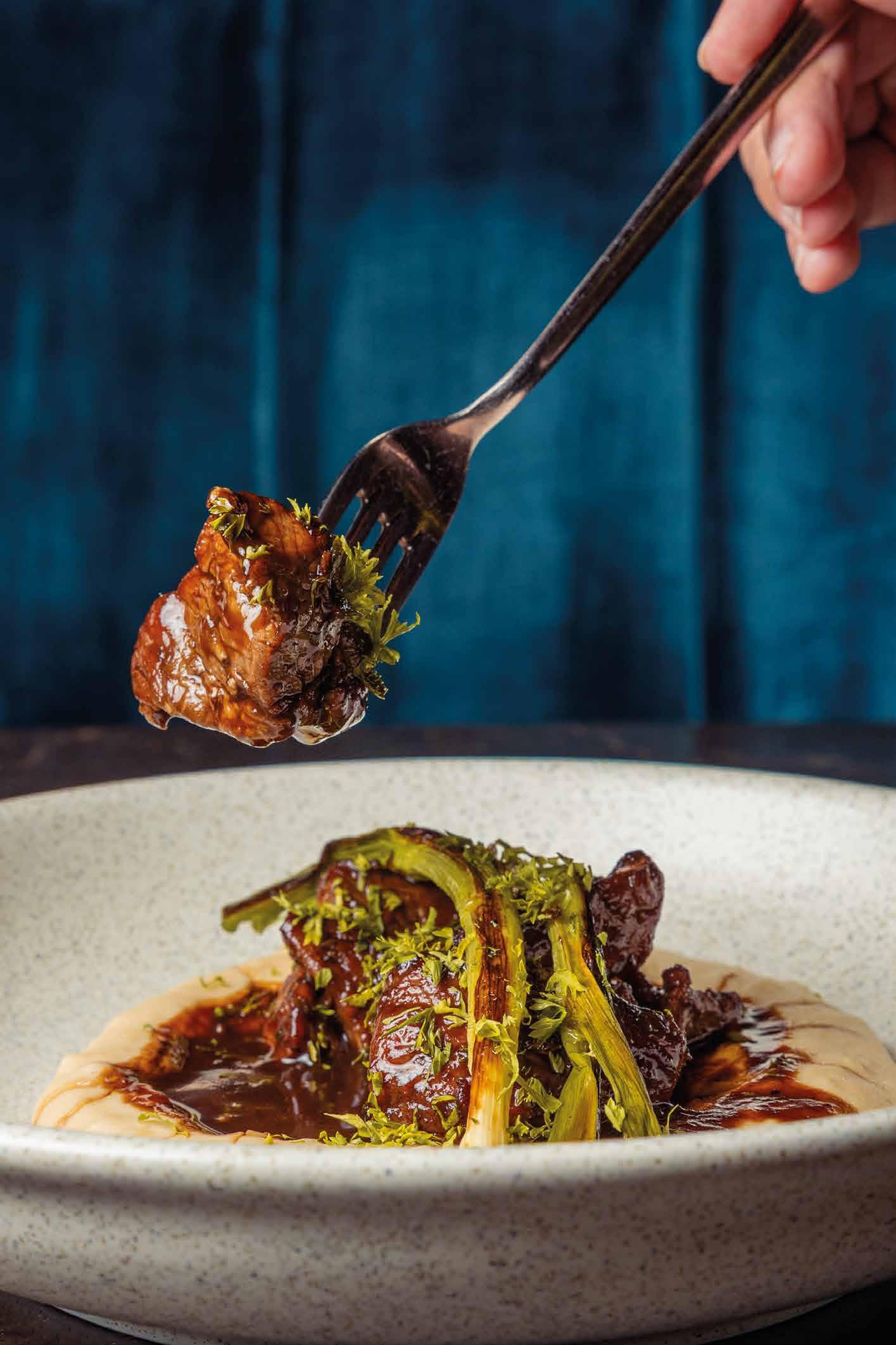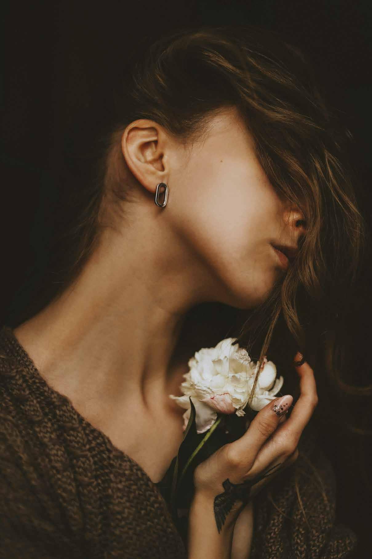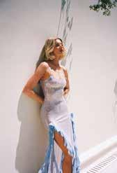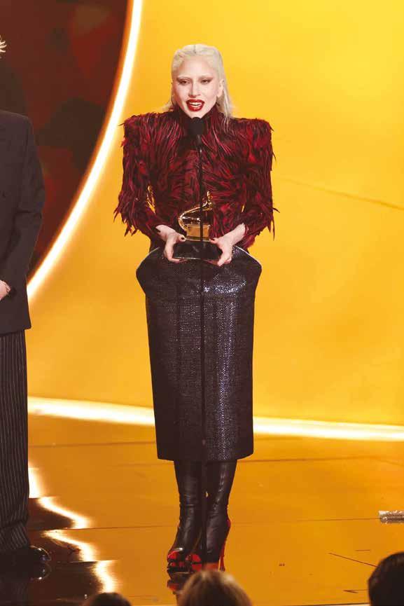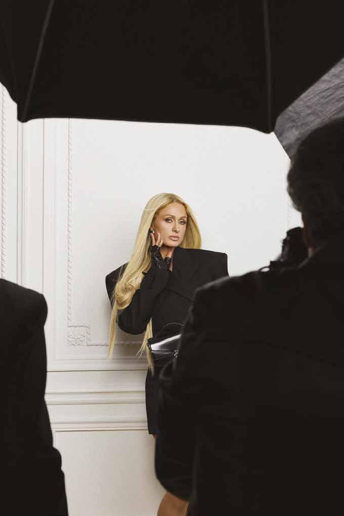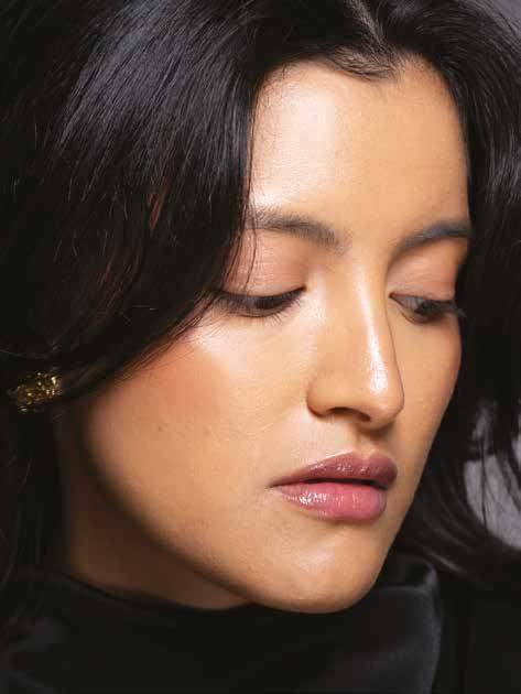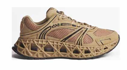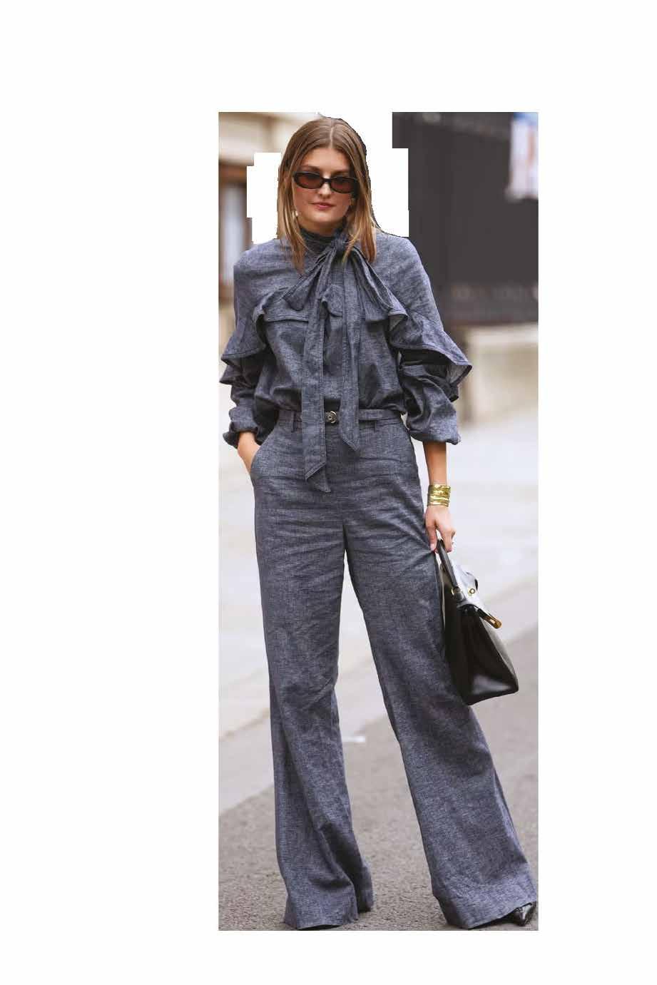 Cuellos blancos emergen con protagonismo, mientras que los cuellos tipo biker aportan un toque rudo, y los cuellos de shearling sugieren grandeza antes de expandirse en un abrigo completo de shearling. La textura y el color de nen una escena urbana de tonos neutros y matices sobrios, ocasionalmente iluminados con destellos de tangerina o burdeos. Los tejidos abarcan desde lanas de sastrería de acabado seco hasta jersey acanalado, terciopelo uido, satén laminado, algodones, grosgrains y spazzolato, así como cueros opacos y transparentes.