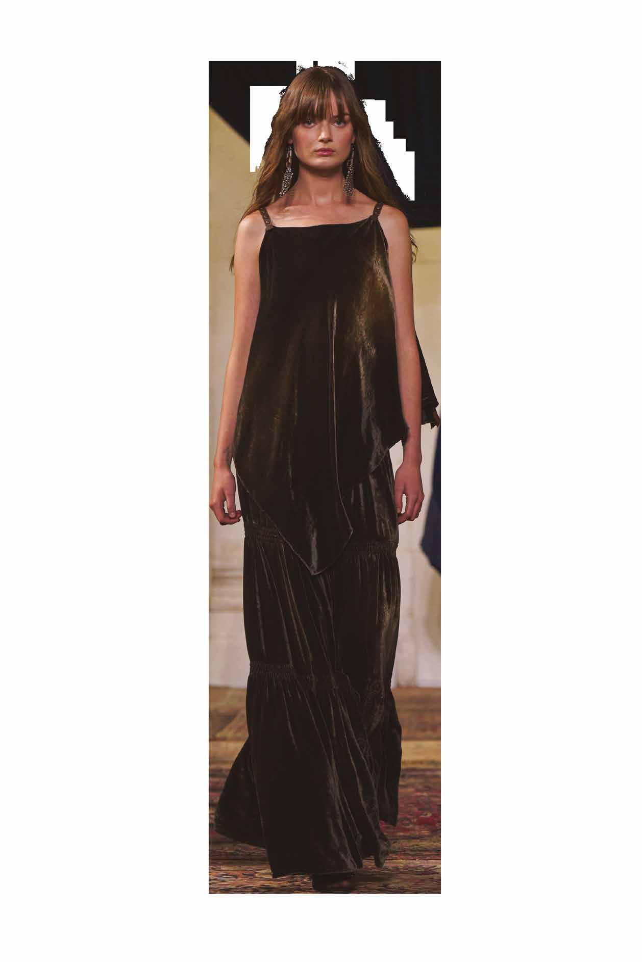 A lo largo de los distintos estilos, la silueta es alta y recta; la sastrería precisa y ajustada, con inesperadas espaldas descubiertas y detalles sin mangas, crea tensión, mientras que los vestidos intensamente trabajados presentan espaldas lisas en contraste que revelan su estructura interna.