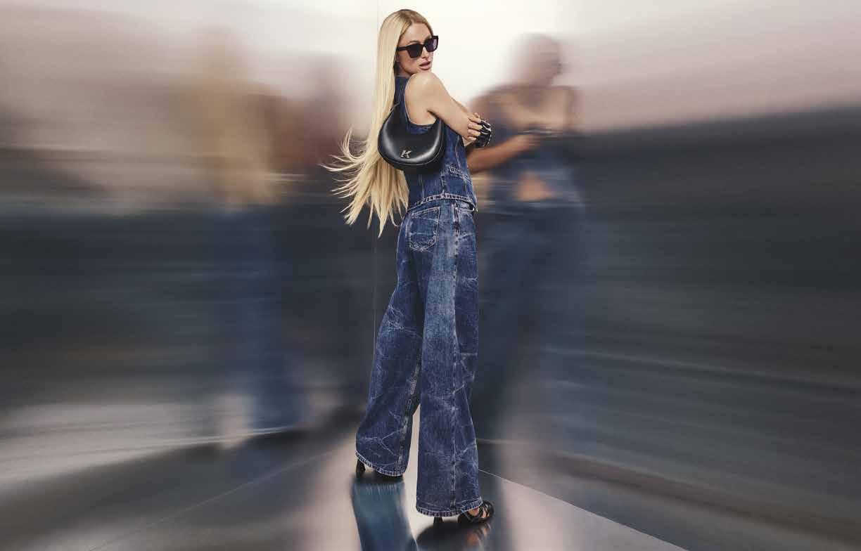 La expresión de e Collection otoño 2026 se transmite a través de piezas esenciales: trajes sastre, trench coats, blusones, abrigos y vestidos combinados con stilettos, ats, botas, clutches y bolsos tipo du e, además de guantes en tonos monocromáticos. El denim cobra protagonismo mediante una reinterpretación del archivo de 1976, el primero presentado en la pasarela de Calvin Klein: un traje completo de denim llevado bajo abrigos de silueta esbelta, y el logotipo original escrito a mano bordado en una chaqueta aviador y en un trench coat a cuadros.