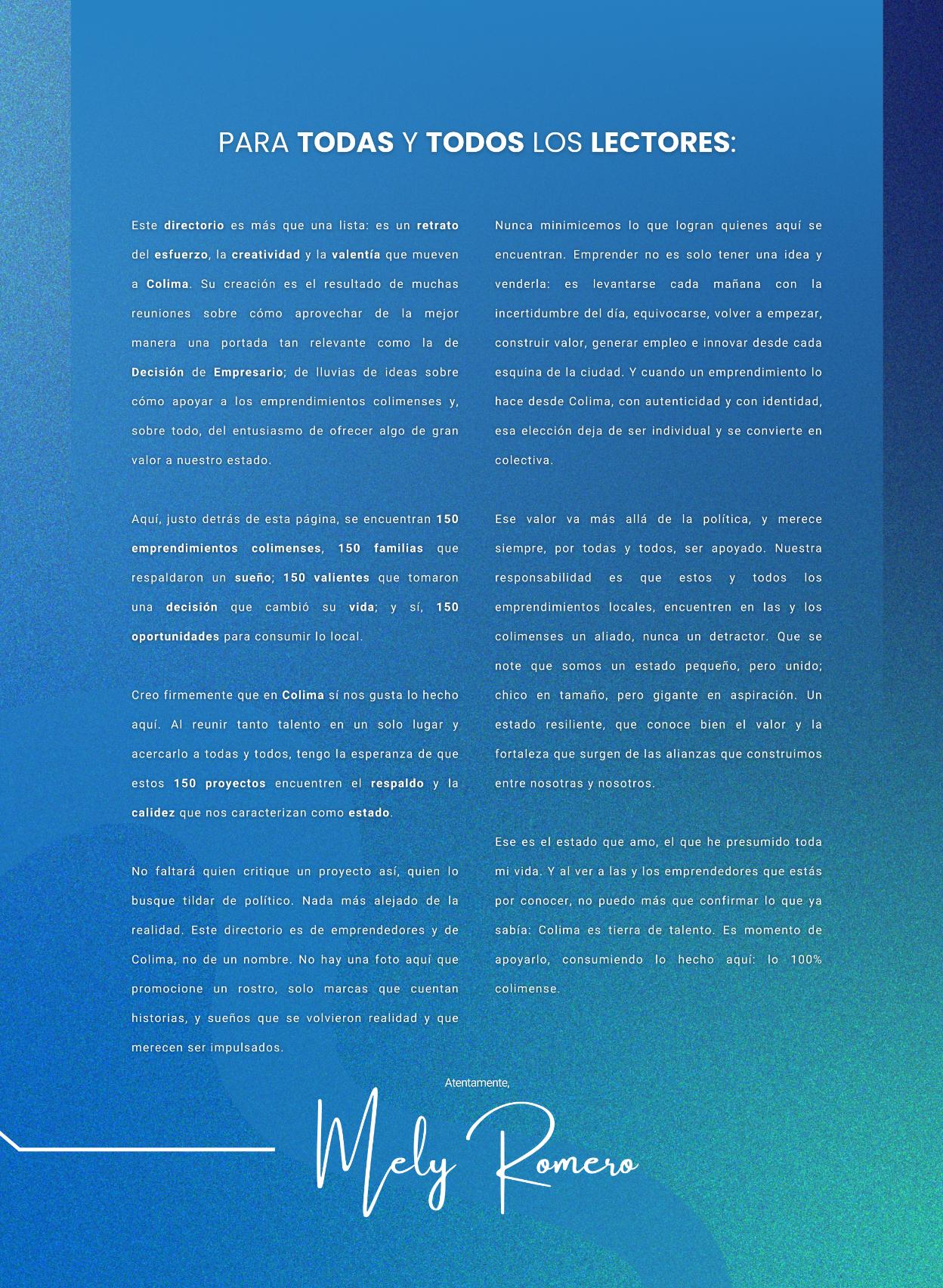 Este proyecto nació del trabajo conjunto con la senadora Mely Romero, quien coincide con nosotros en el principio básico, que dio origen a las páginas que tienes en mano: Colima no solo importa como “destino turístico” o “ciudad pequeña bonita”, sino como semillero de talentos capaces de ofrecer productos, servicios y experiencias que competirían con cualquiera del país; después de todo aquí también hay café, también hay diseño, también hay tecnología, también hay manufactura ligera, también hay creatividad.