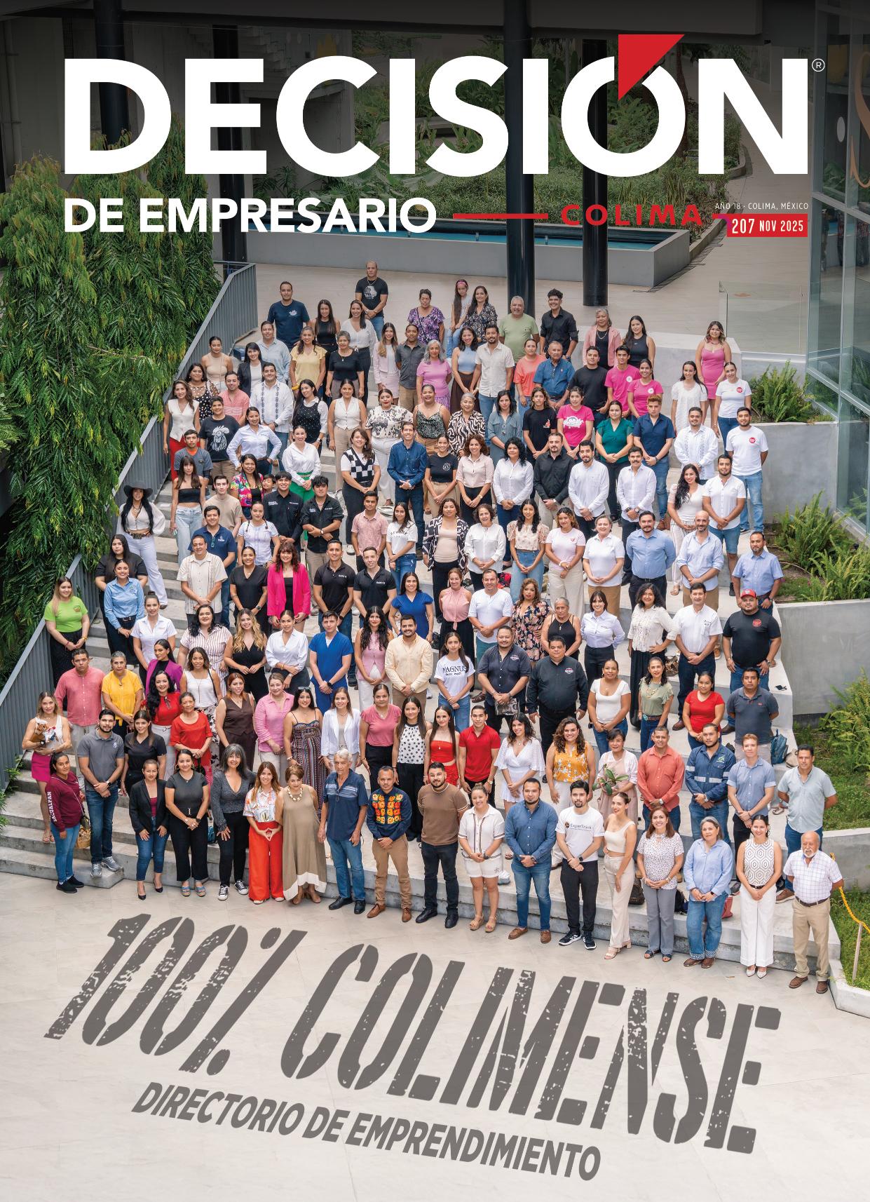 ������������. De manera gratuita por mensajería en todo el estado de Colima. Si desea recibir la revista en su domicilio, favor de suscribirse en la página web www.decisiondeempresario.com AÑO 18, NÚMERO 207. PUBLICACIÓN: 1 DE NOVIEMBRE DE 2025. Revista mensual editada y publicada por Editorial Tsur yAsociados S.A. de C.V. Número de certificado de reserva otorgado por INDAUTOR 042020-121609031800-01. Número de certificado de licitud de Titulo y contenido 00-014-A-1436-20 con domicilio en Amatista #101 Col. Residencial Esmeralda Norte C.P. 28017 Colima, Col., México. Decisión de Empresario investiga sobre la seriedad de sus anunciantes, pero no se responsabiliza con las ofertas ni contenidos relacionados con los mismos.Prohibidasureproducciónparcialototal.ImpresaenMéxico,printed in Mexico por Tsury Asociados S.A. de C.V. Ejido Tomatlán 53 Col. San Francisco Culhuacán,04420 Coyoacán, CDMX. todos los derechos reservados, all rights reservedcopyrigth 2023.