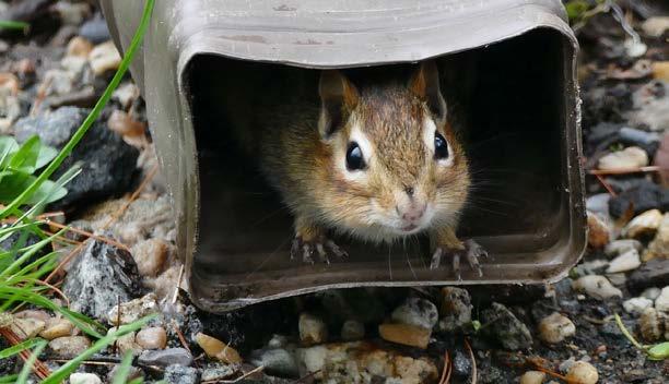 A chipmunk takes cover in a downspout extension in a Canton yard — chipmunks are in the squirrel family — there are 25 species , 24 in North America