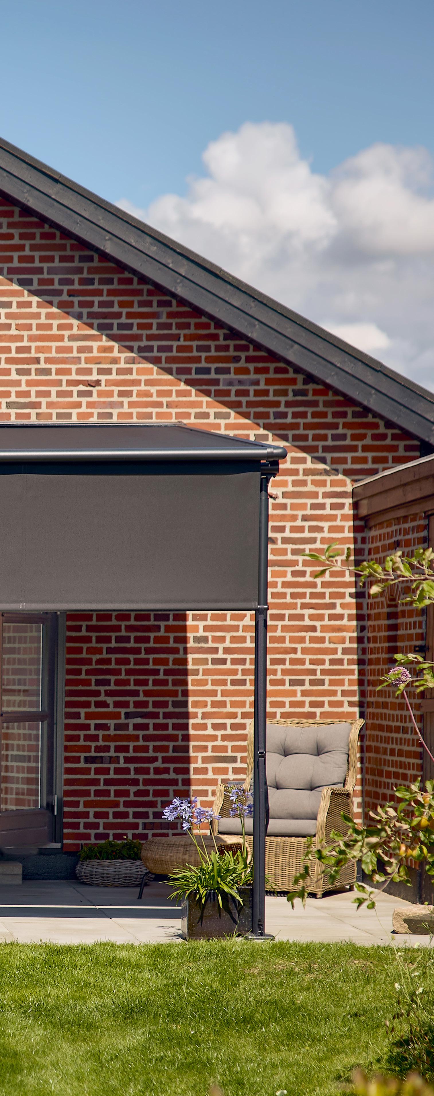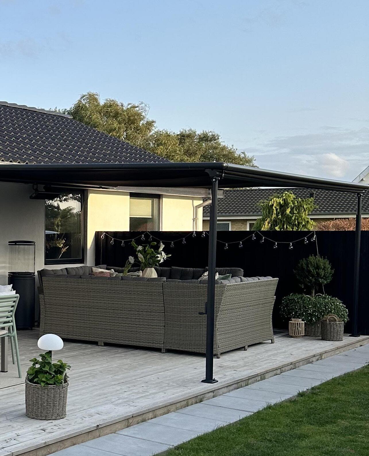• Stabil og vejrbestandig: Den faste konstruktion med lodrette stolper giver en mere stabil og vindstærk løsning end en traditionel markise, hvilket gør pergolamarkisen ideel til det omskiftelige nordiske vejr.