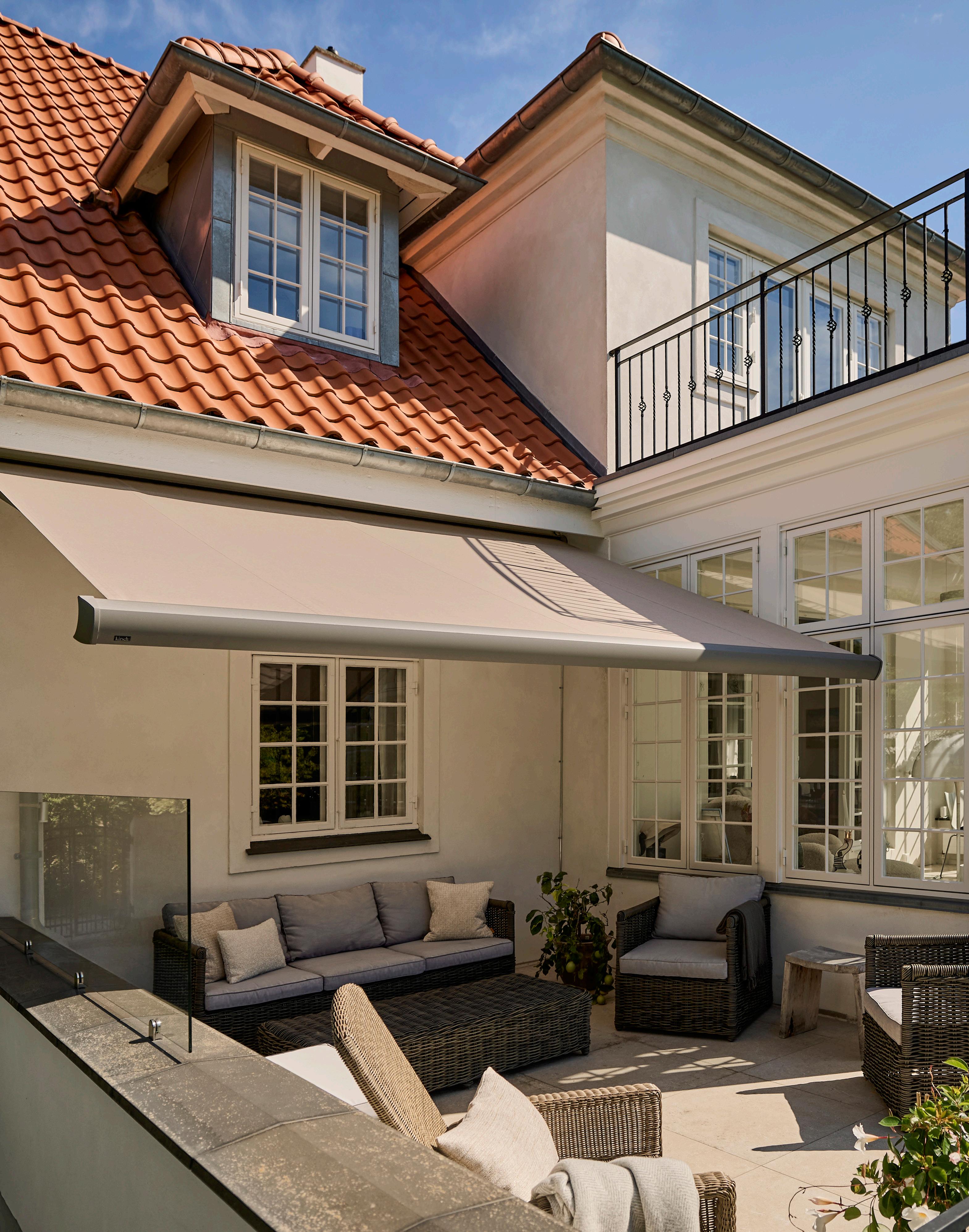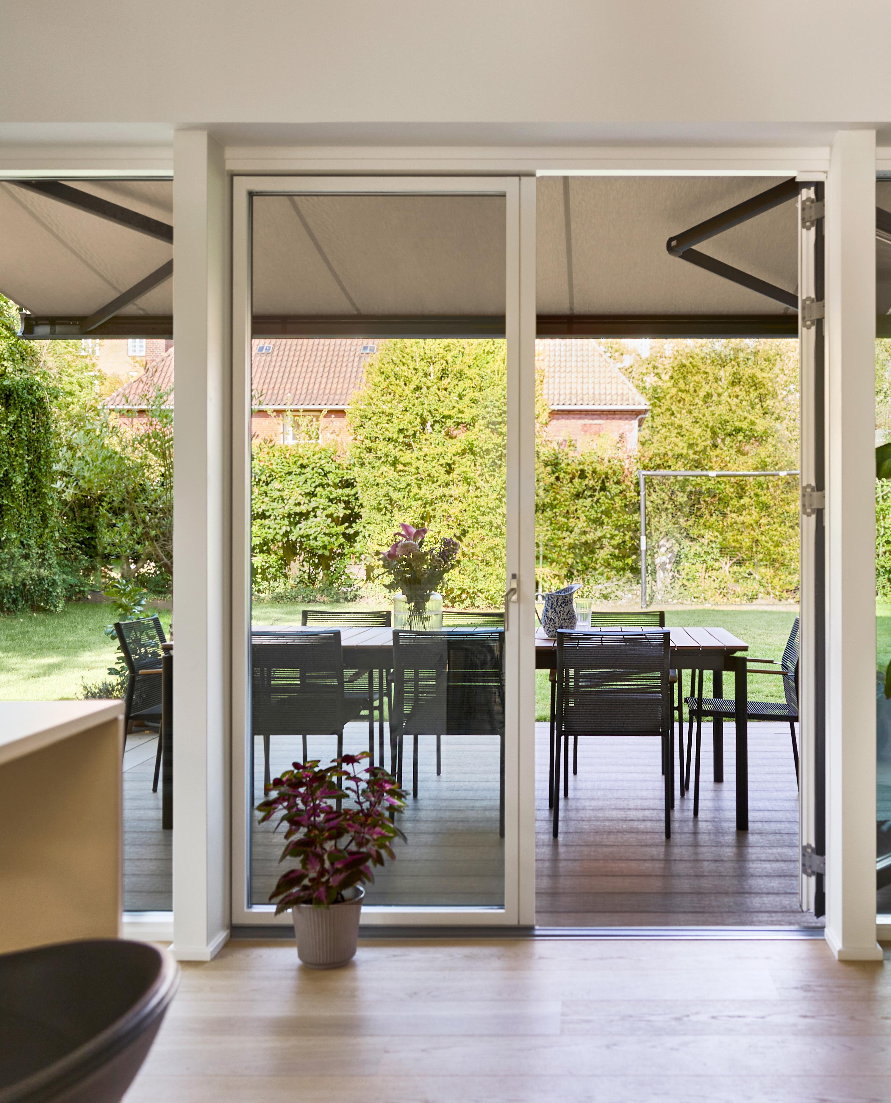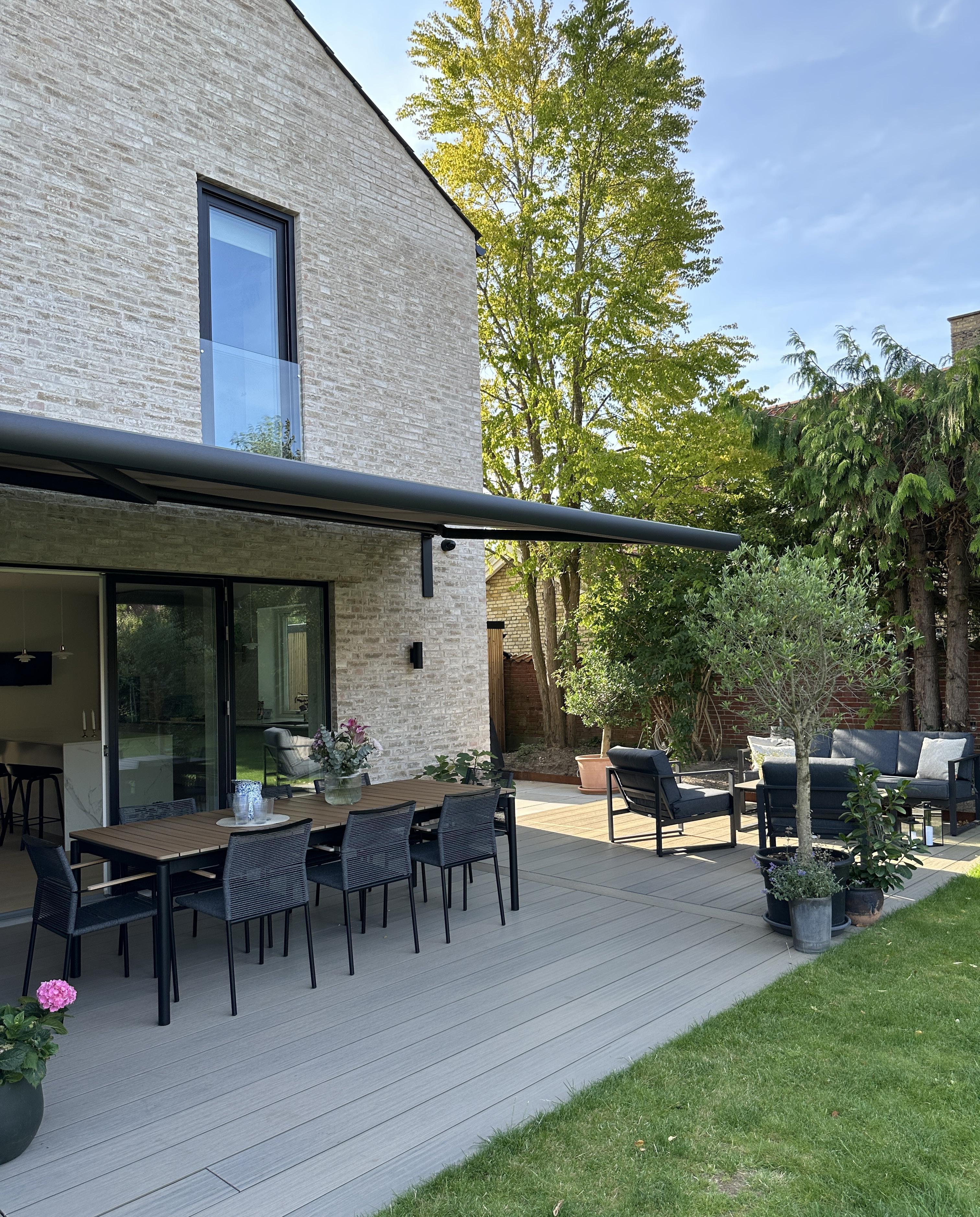 For Katja var det vigtigt, at markisen var diskret, når den ikke blev brugt. Derfor valgte hun en Kirsch Sigma markise med lukket kassette i aluminium. Den er både diskret og beskytter markisen mod vejr og vind. Valget faldt på en hvid markise med imprægnering, som holder sig flot og ren i mange år.