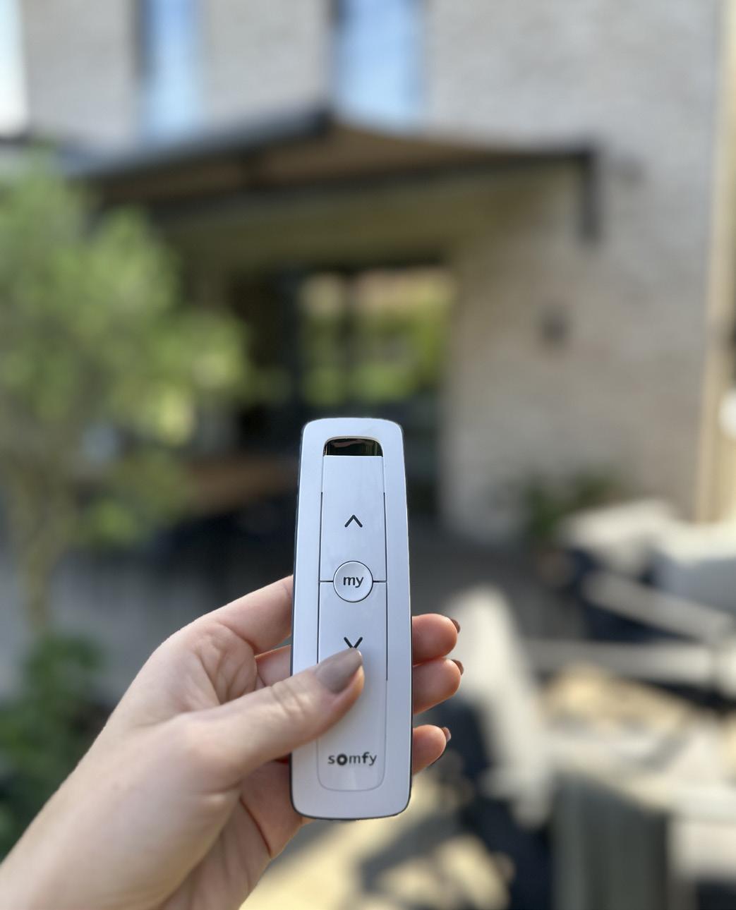 Somfy tilbyder ekstra støjsvage IO- eller RTS-motorer samt flere betjeningsmuligheder, herunder fjernbetjening og app-styring via TaHoma Switch – en smart hub, der samler og styrer alle hjemmets Somfy-produkter. Systemet kan også integreres med smartprodukter fra bl.a. Alexa, Google Home, Sonos, IHC og Philips, hvilket giver fuld kontrol over markisen, uanset hvor du befinder dig.