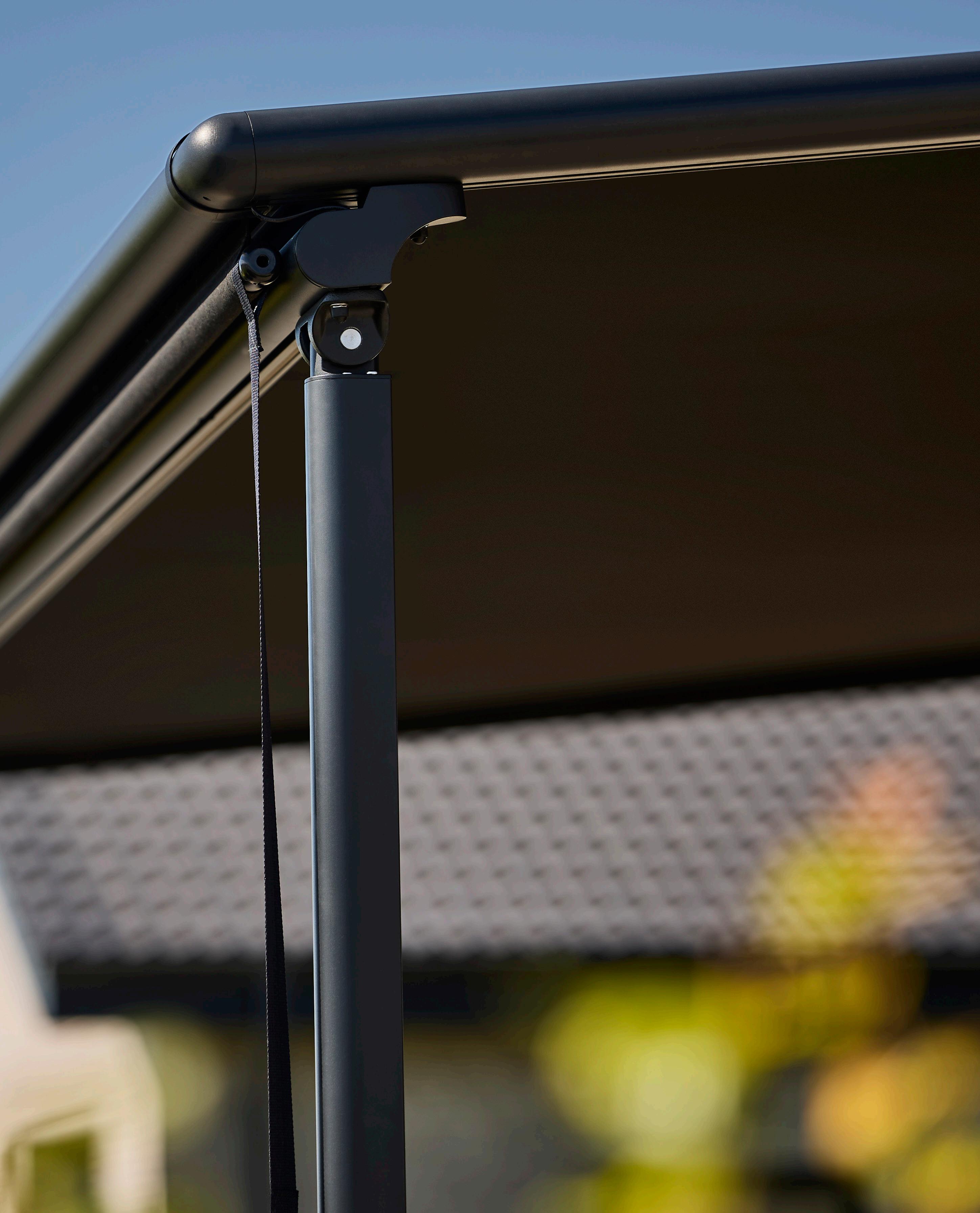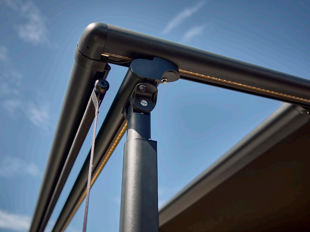 • Mindre belastning: I modsætning til traditionelle markiser fordeler Sigma pergolaen vægten via de lodrette ben, hvilket gør den ideel til montering på vægge af træ eller gasbeton, hvor en markise kan være for tung.