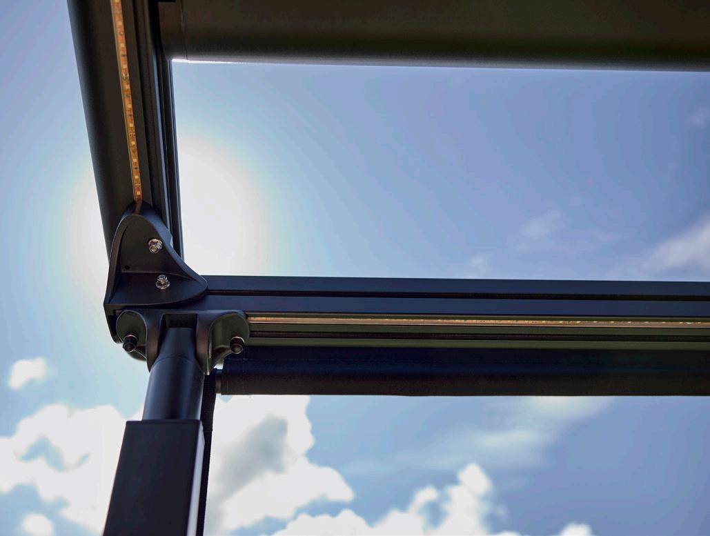 • Integreret LED-lys: Pergolaen har integreret LED-lys i rammen. Med to lysstyrker (50% og 100%) kan du skabe den perfekte stemning til både afslapning og sociale sammenkomster – uanset tidspunkt på dagen.