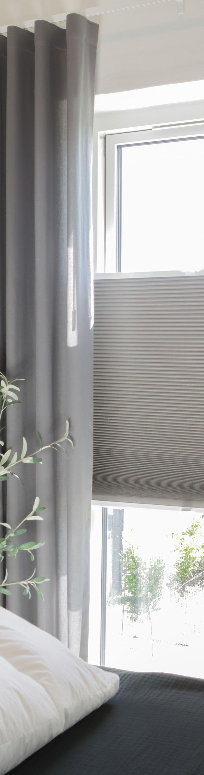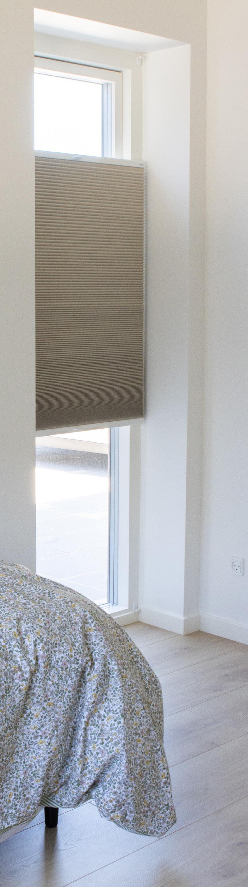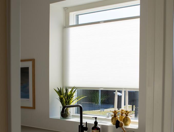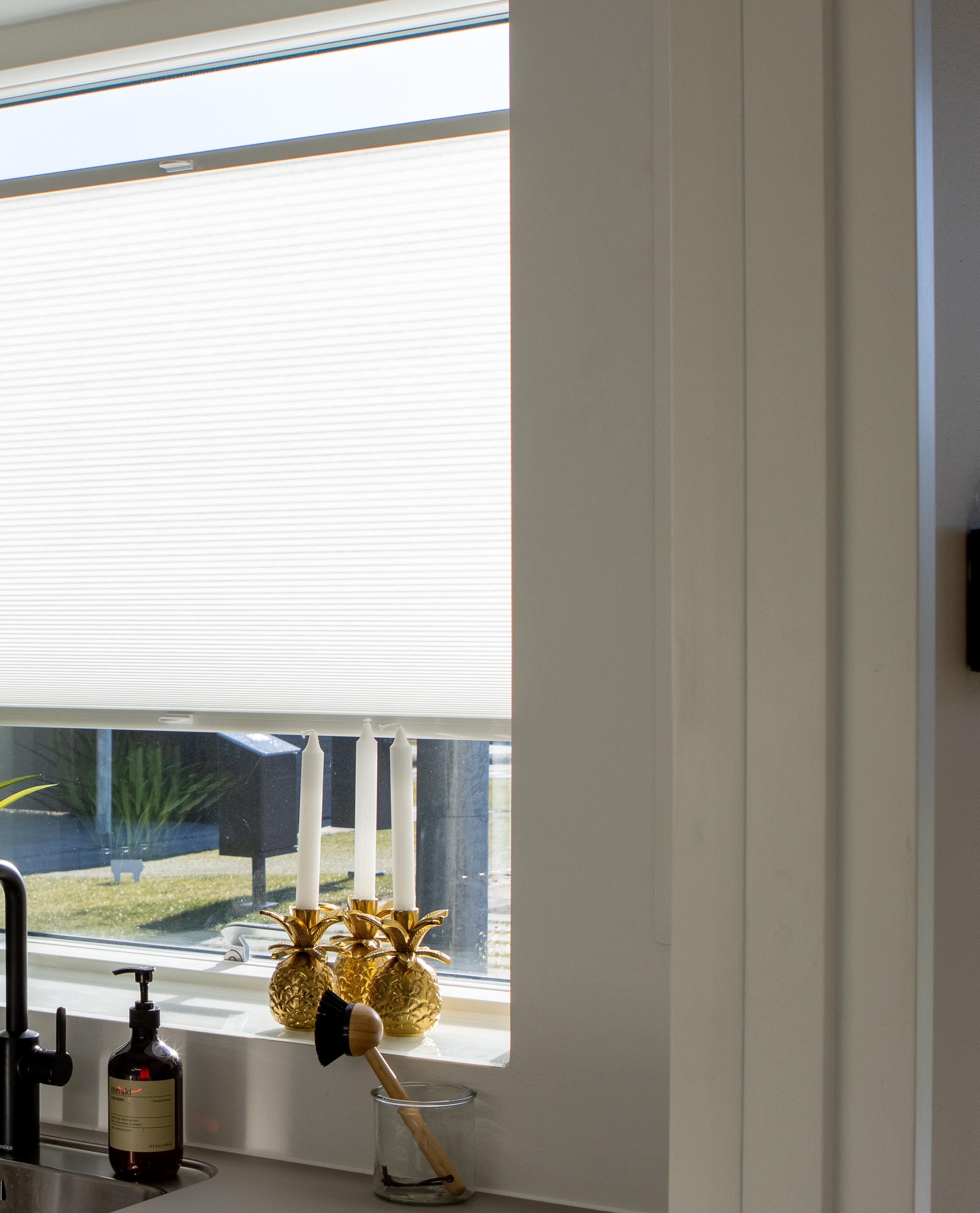 Med up and down-plisségardiner kan lys og privatliv tilpasses efter både rummet og tidspunktet på dagen. Gardinet kan justeres både nedefra og oppefra, så det skærmer for indkig nedefra, mens dagslyset stadig kan strømme ind oppefra. En ideel løsning til nybyggeri, hvor haven stadig er åben, og I ønsker både lys, udsyn og afskærmning på samme tid.