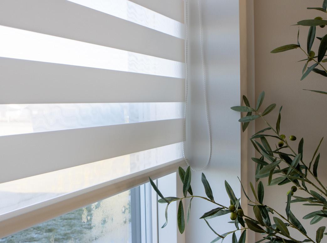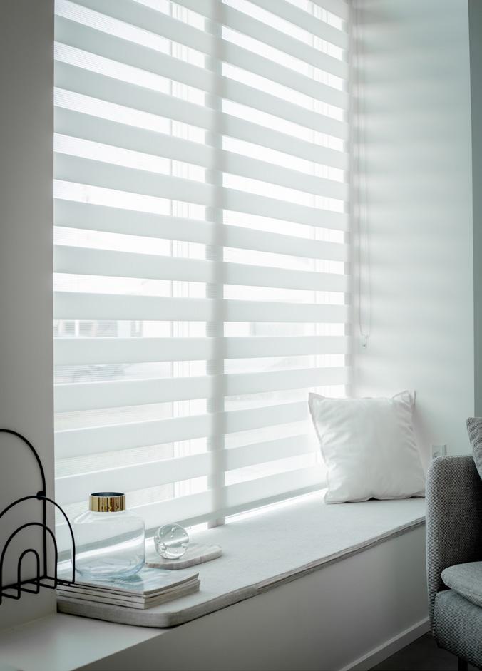 Duo rullegardiner består af to lag stof med hhv. transparente og tætte striber, der glider forbi hinanden og gør det muligt at justere lyset præcist efter behov.