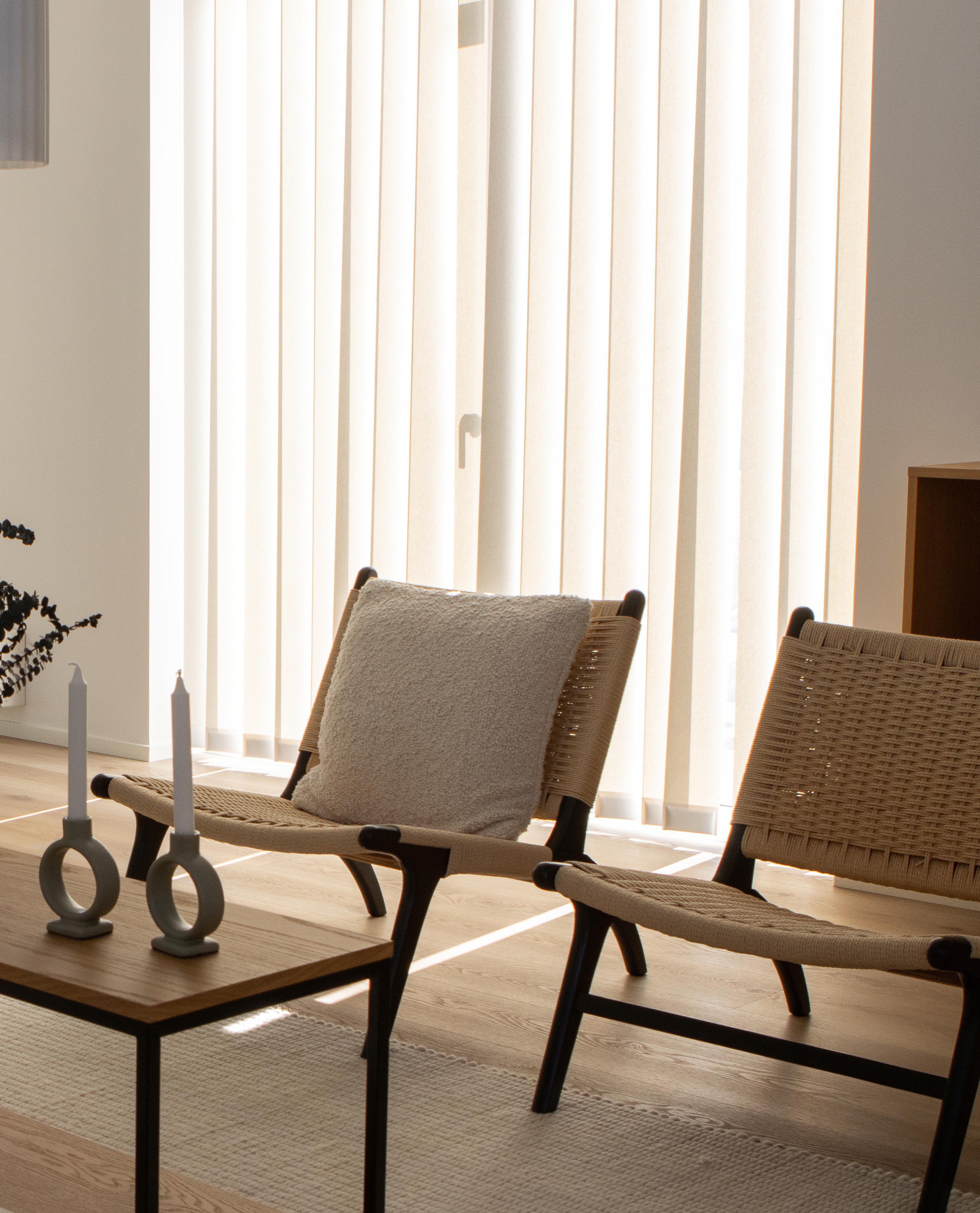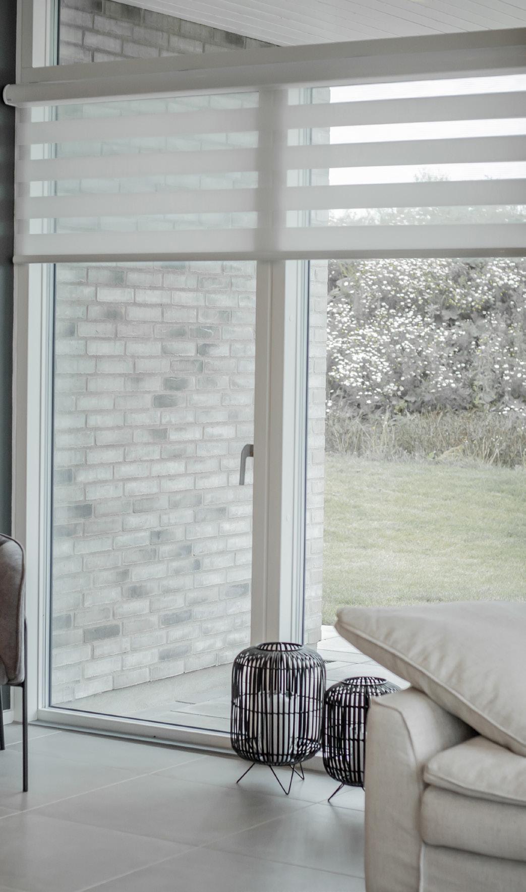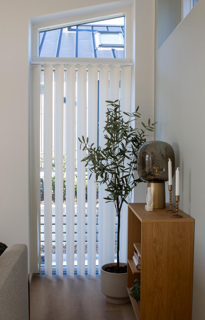 Store vinduespartier inviterer lyset indenfor og giver hjemmet et åbent og luftigt udtryk. Med lamelgardiner kan lyset dæmpes og styres, så rummet er lyst, men samtidig privat. De lodrette linjer understreger arkitekturen og giver et moderne, harmonisk udtryk, der passer perfekt til store rum med masser af dagslys.