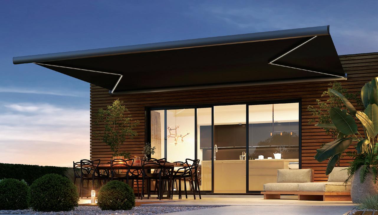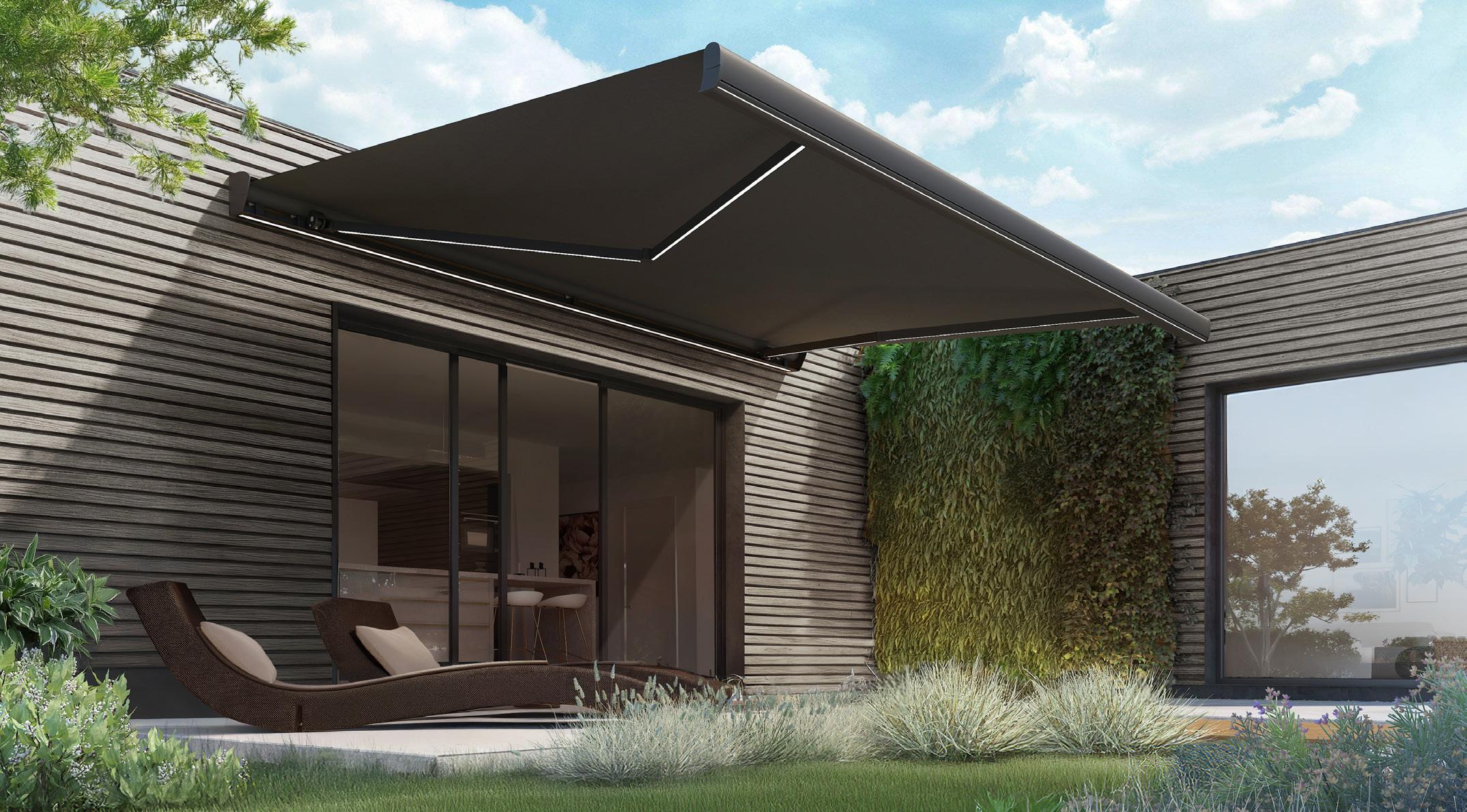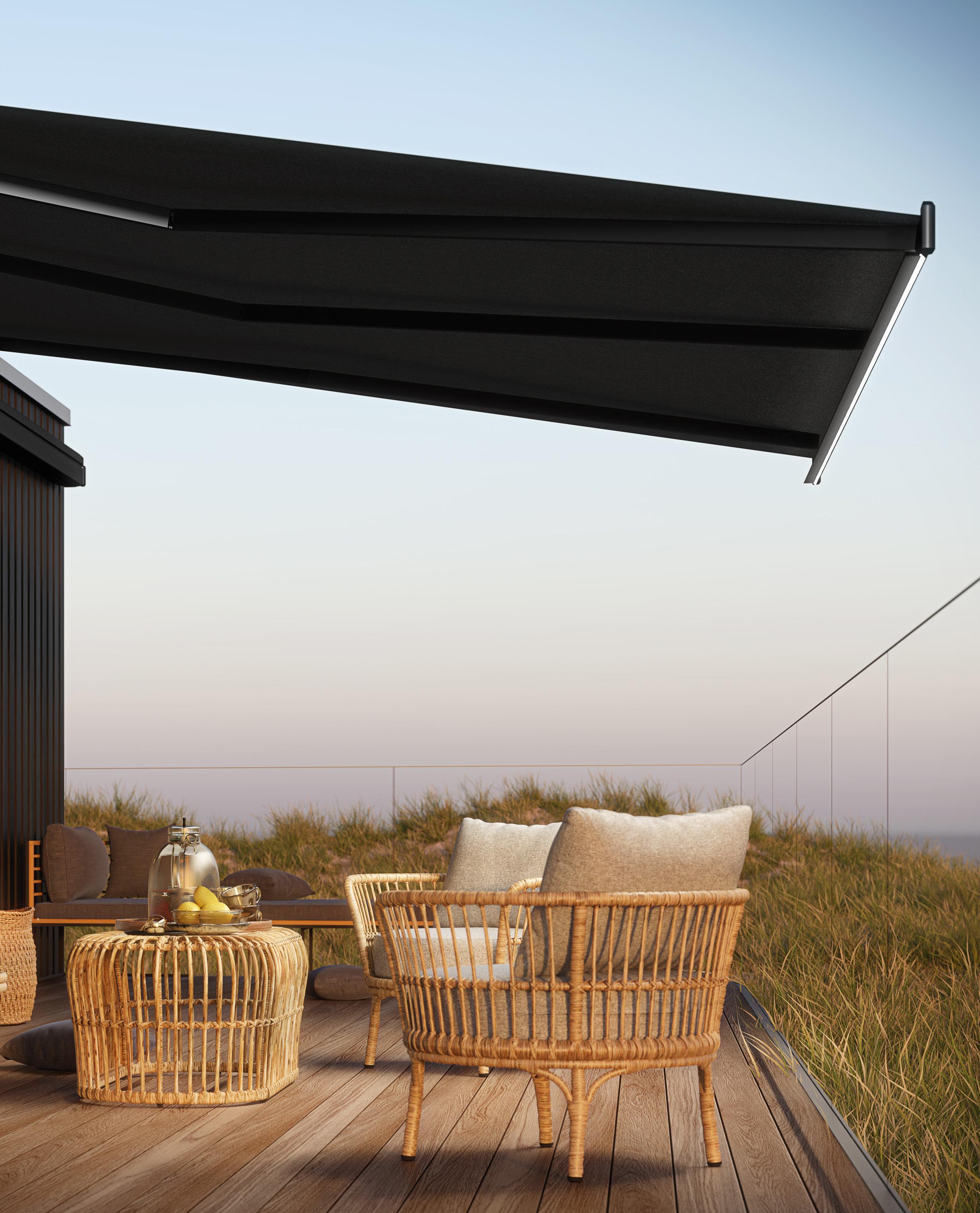 Markisen oser af moderne eksklusivitet og leveres inklusiv motor, fjernbetjening og LED-belysning i frontbommen.