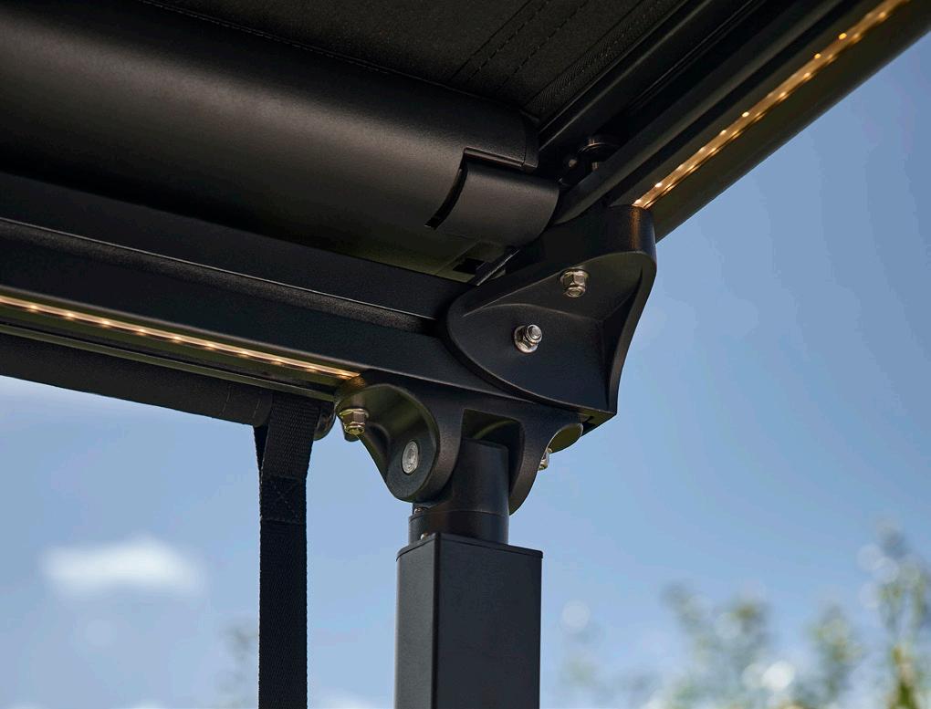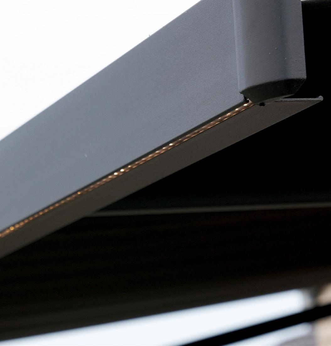 • Integreret LED-lys: Pergolaen har integreret LED-lys i rammen. Med to lysstyrker (50% og 100%) kan du skabe den perfekte stemning til både afslapning og sociale sammenkomster – uanset tidspunkt på dagen.