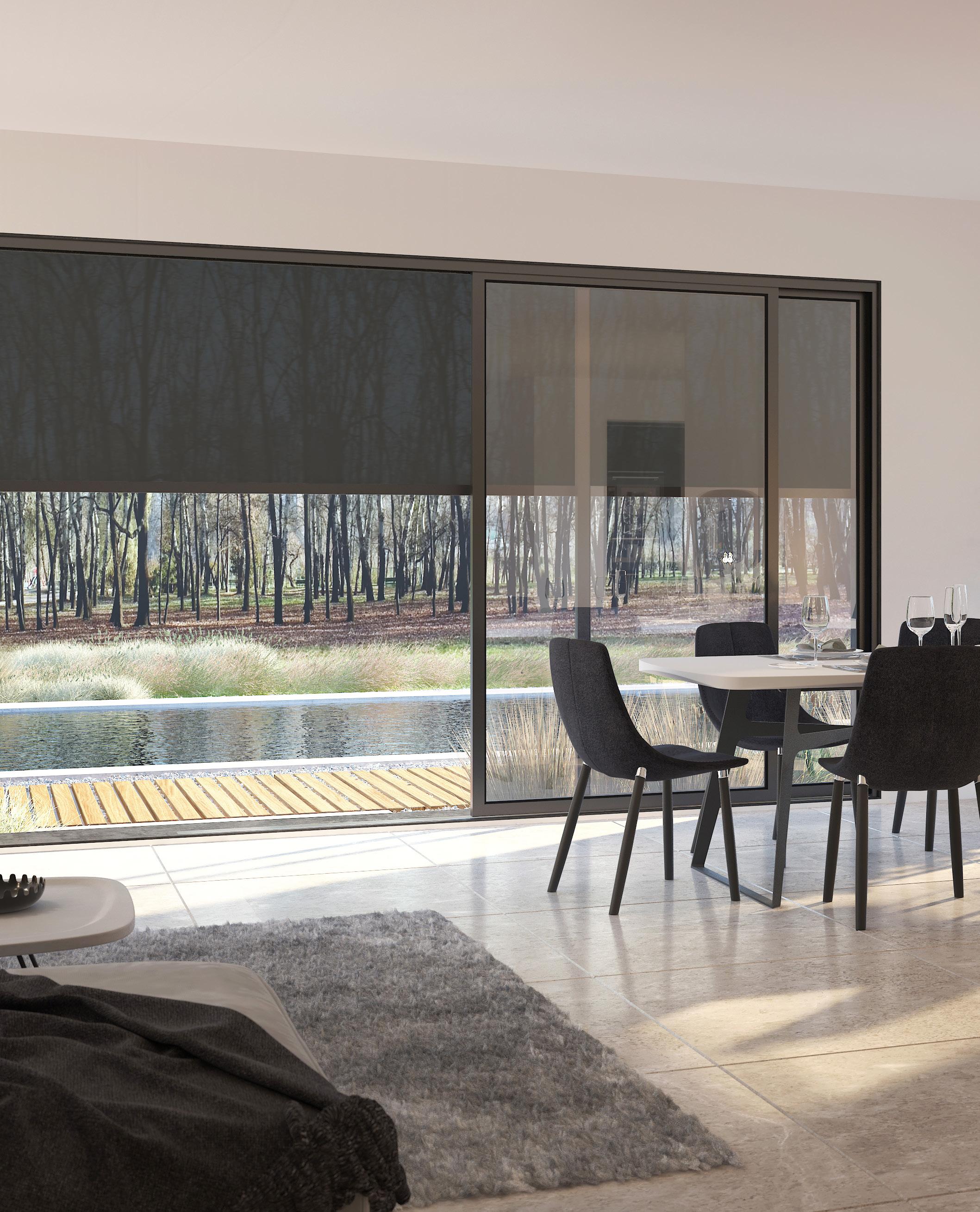 Transparent screen med optisk komfort. Reducerer intensiteten af sollyset uden at skabe et mørkt indendørsmiljø.