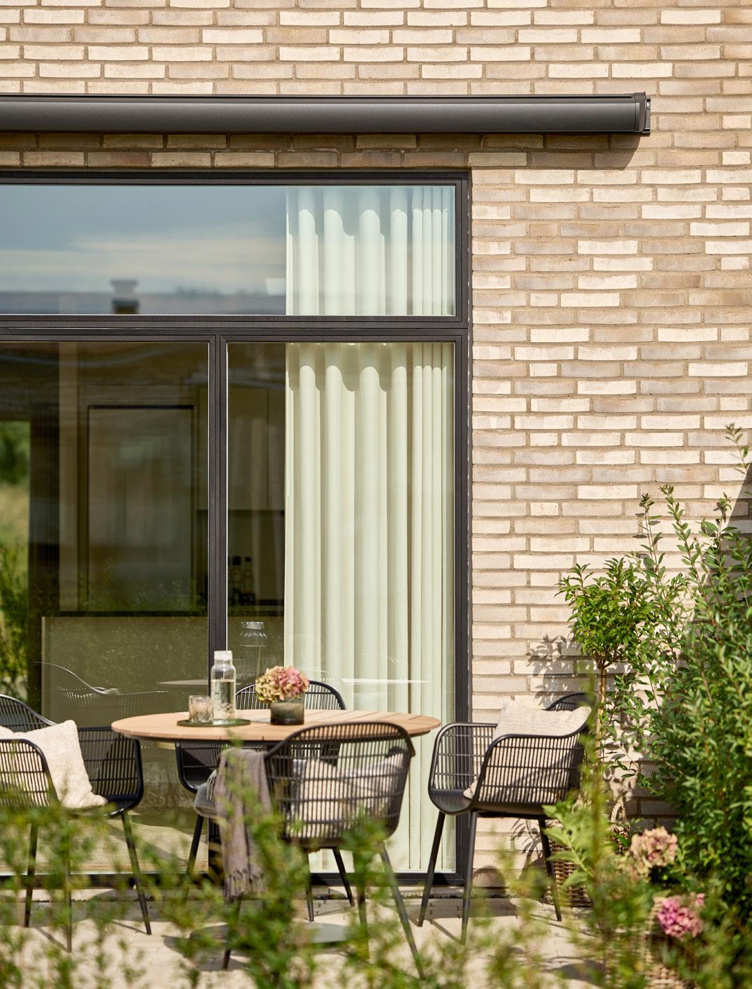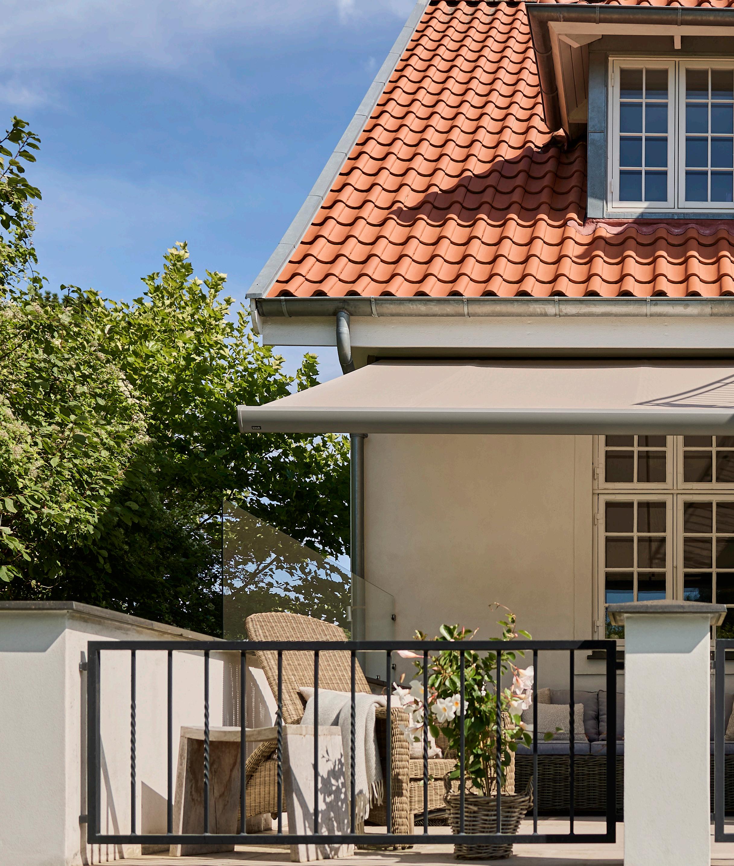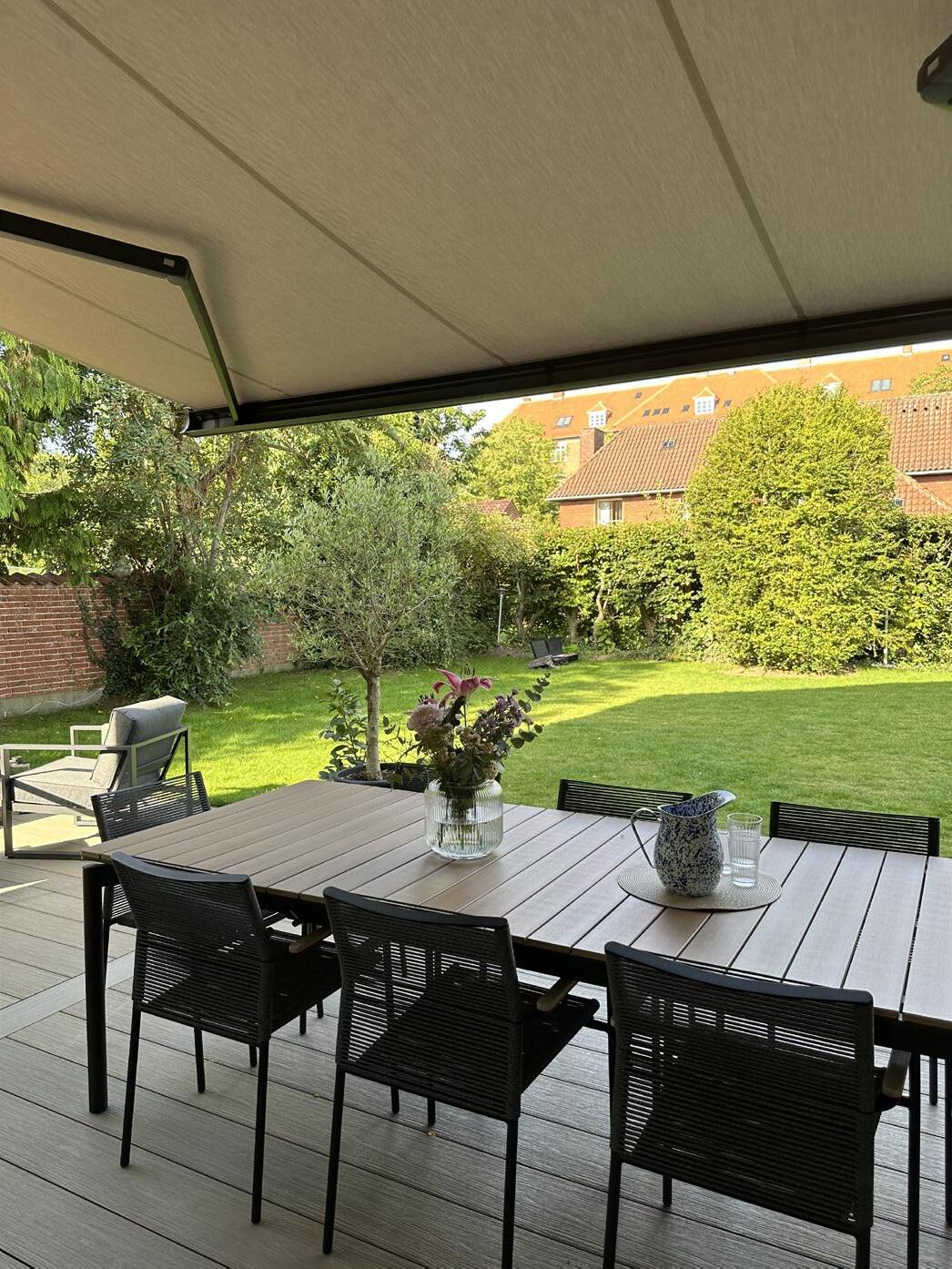 For Katja var det vigtigt, at markisen var diskret, når den ikke blev brugt. Derfor valgte hun en Kirsch Sigma markise med lukket kassette i aluminium. Den er både diskret og beskytter markisen mod vejr og vind. Valget faldt på en hvid markise med imprægnering, som holder sig flot og ren i mange år.