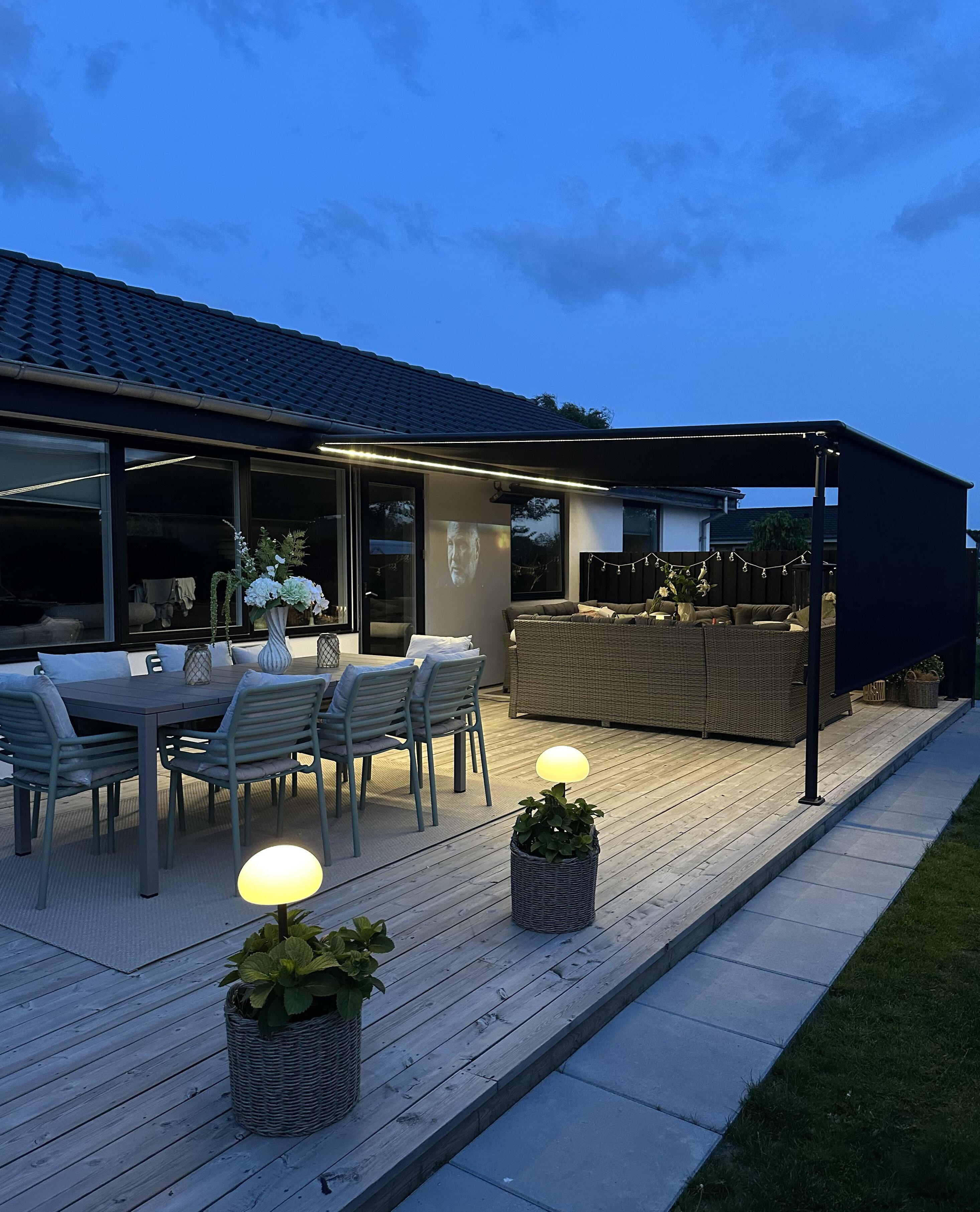 • Indbygget lys for ekstra hygge: Integreret LED-lys skaber en stemningsfuld atmosfære, så terrassen kan nydes både dag og aften.
