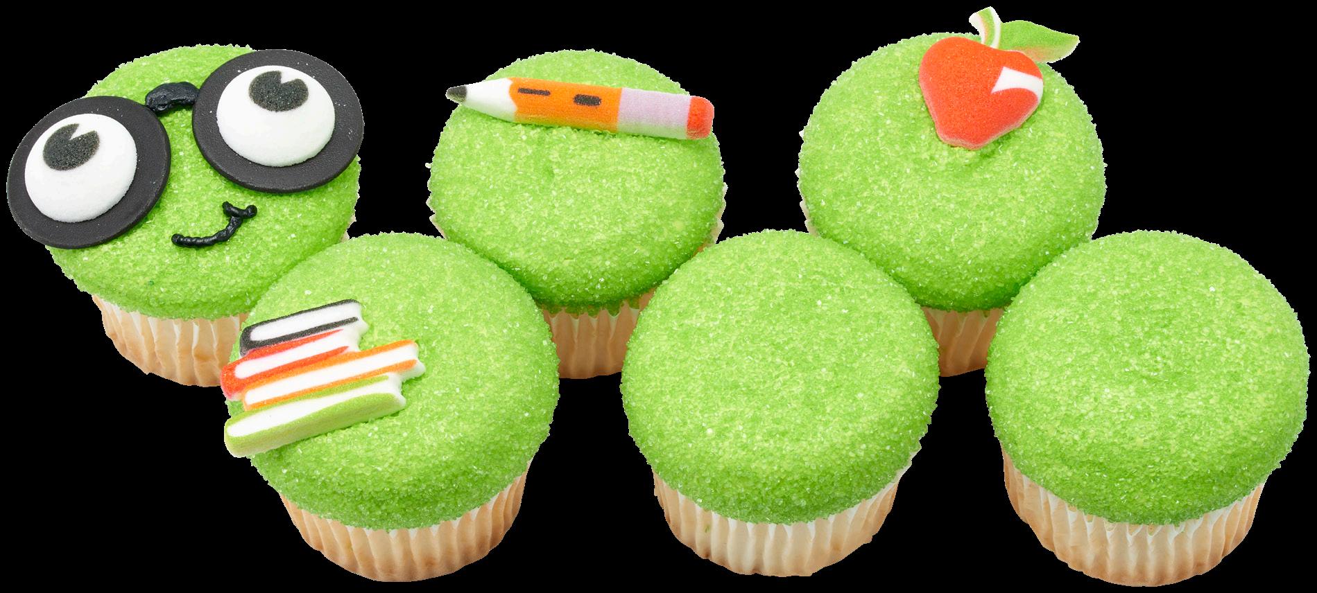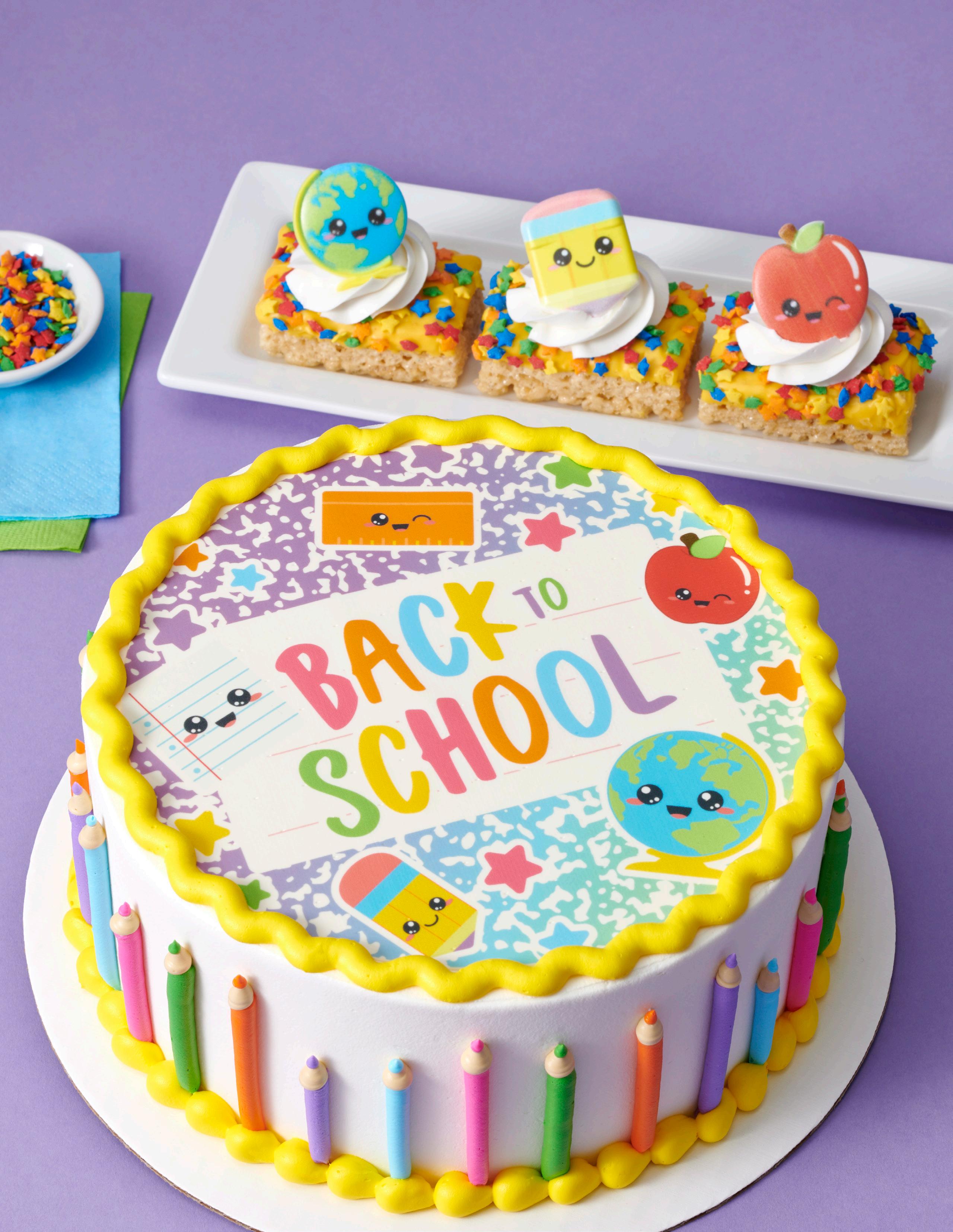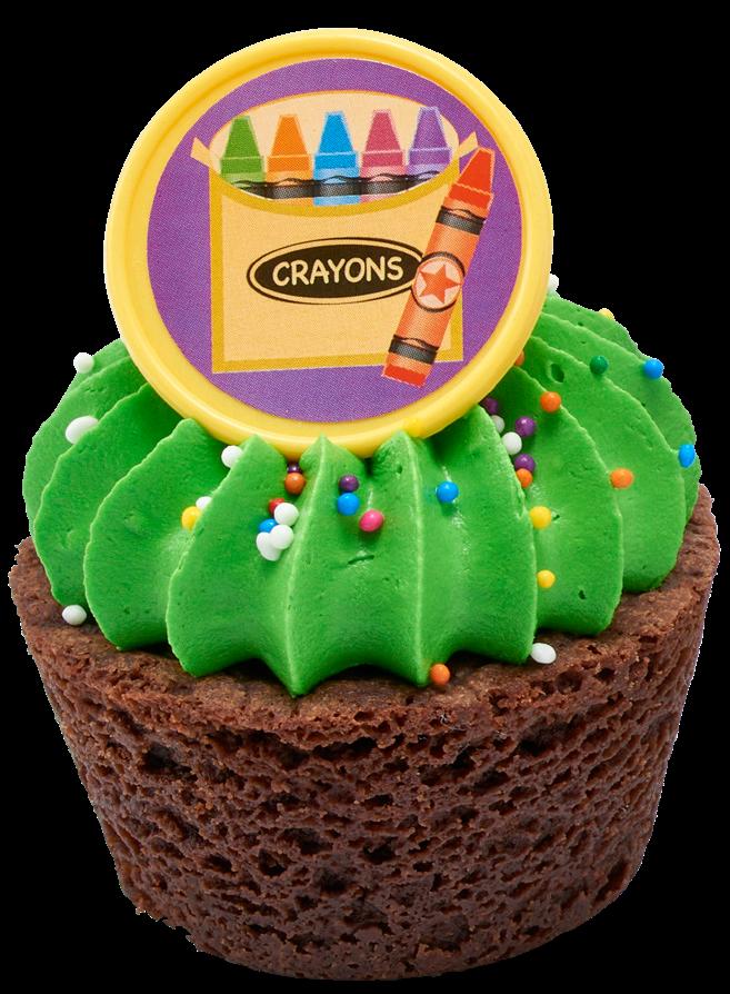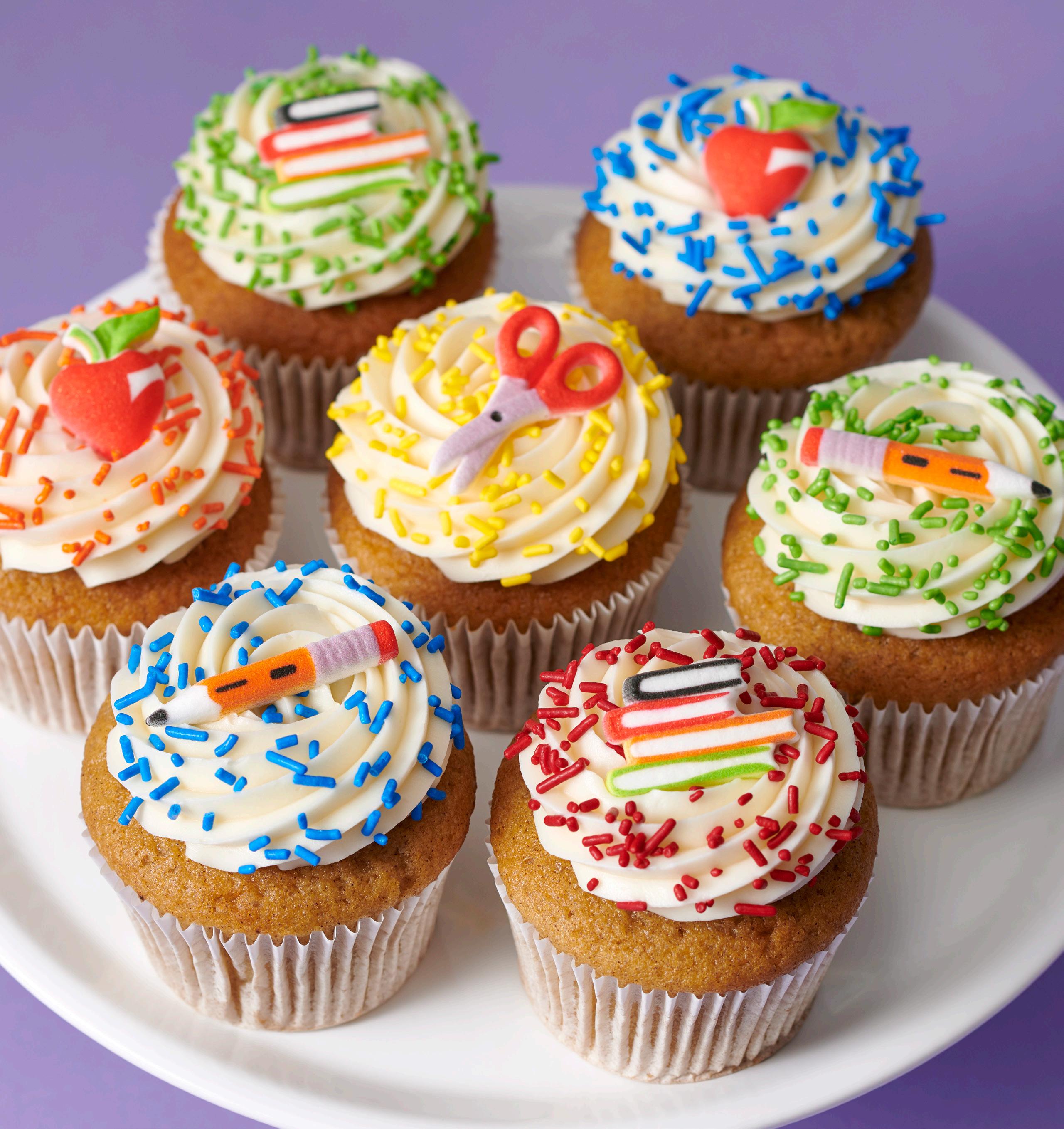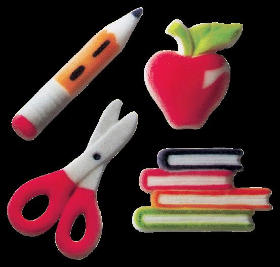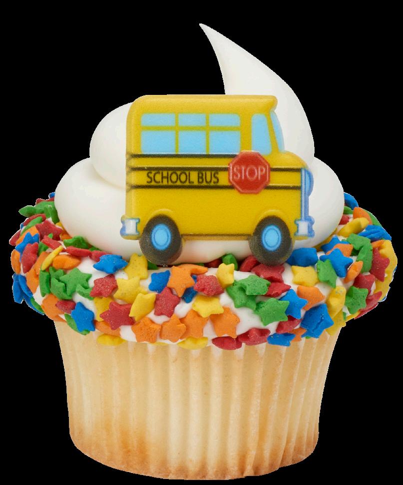 Shown: #38825 School Icons Rings, #21355/9472 Green Sprinkles, and #21046/8784 Red Sanding Sugar Key Bakery Dates Back to School 2023: Begins in August Set in store: 3 Weeks Prior to Local Start Date 3 Donuts 5 Cookies Shown: #36089 School Assortment Dec-Ons®, #47121 Large Eyes Dec-Ons, #8845 Black Dots Fondant DecoShapes®, and #21054/10380 Lime Green Sanding Sugar 4 Cupcakes