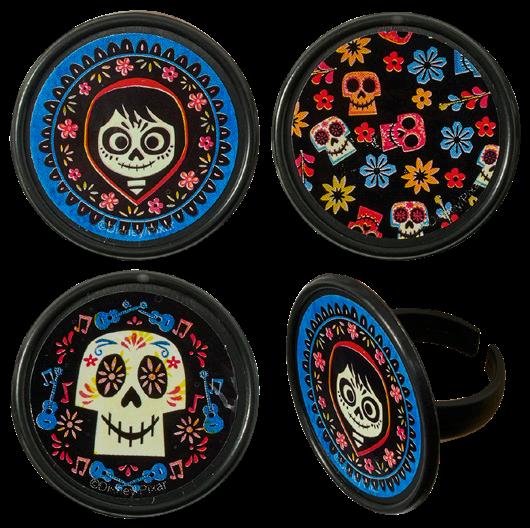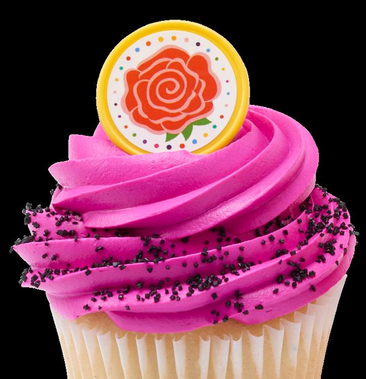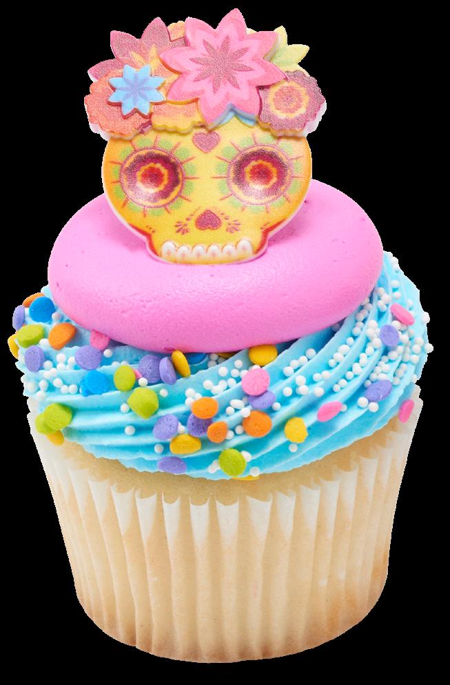 8” top forward with 2 jumbo cupcakes, and 2 cupcakes: #27421 Skeleton Assortment Poly Layon, #24443 Fiesta Spirit Glitter Specialty Candles, #24455 Fiesta Assortment with Gold Specialty Candle, #28447 Spring Butterfly Dec-Ons, #48627 Day of the Dead Skulls Dec-Ons®, #23186 Red .5” SugarSoft® Roses, and #29018 Marigolds SugarSoft® Flowers