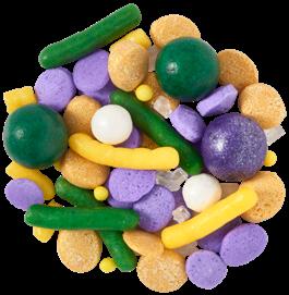Shown on front cover: 7” quad layer round: #29287 Primary Bubble Gum, #27696 Rainbow Party Deluxe Fusion Mix, #29346 Lolli-Pops, #29347 Tutti Frutti Flavored Crunch Candy Bits, #29230 Pastel Mix Resealable 11MM Candy Pearls, #50768 Rainbow Assortment Dec-Ons®, and #36055 Rainbow Star Charms Assortment Dec-Ons®