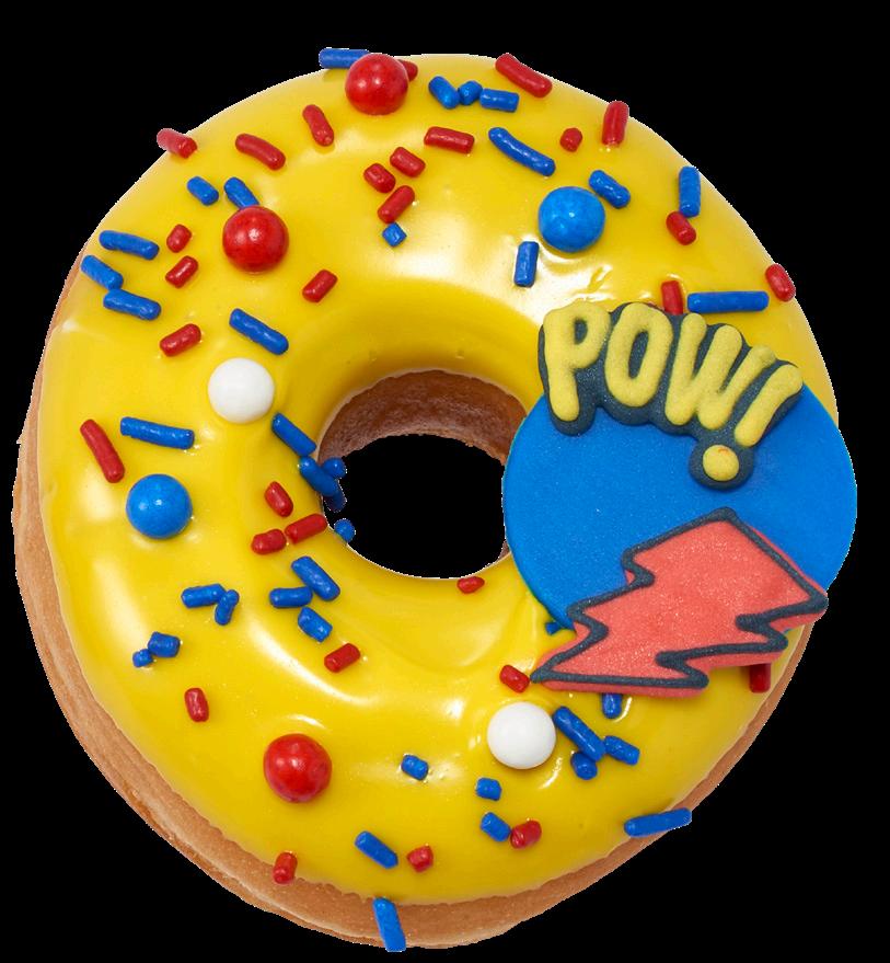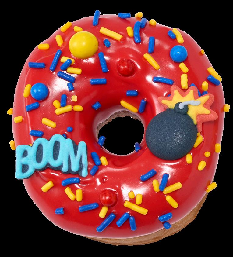 Shown on donuts: #28210 Superheroes - Red 3 Free Royal Icing Decoration, #20703/9738 Red - Red 3 Free Sprinkles, #21056/11809 Dark Blue Sprinkles, and #20705/9464 Yellow - Red 3 Free Sprinkles