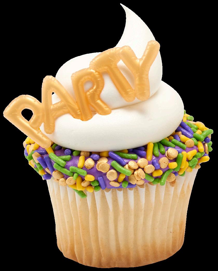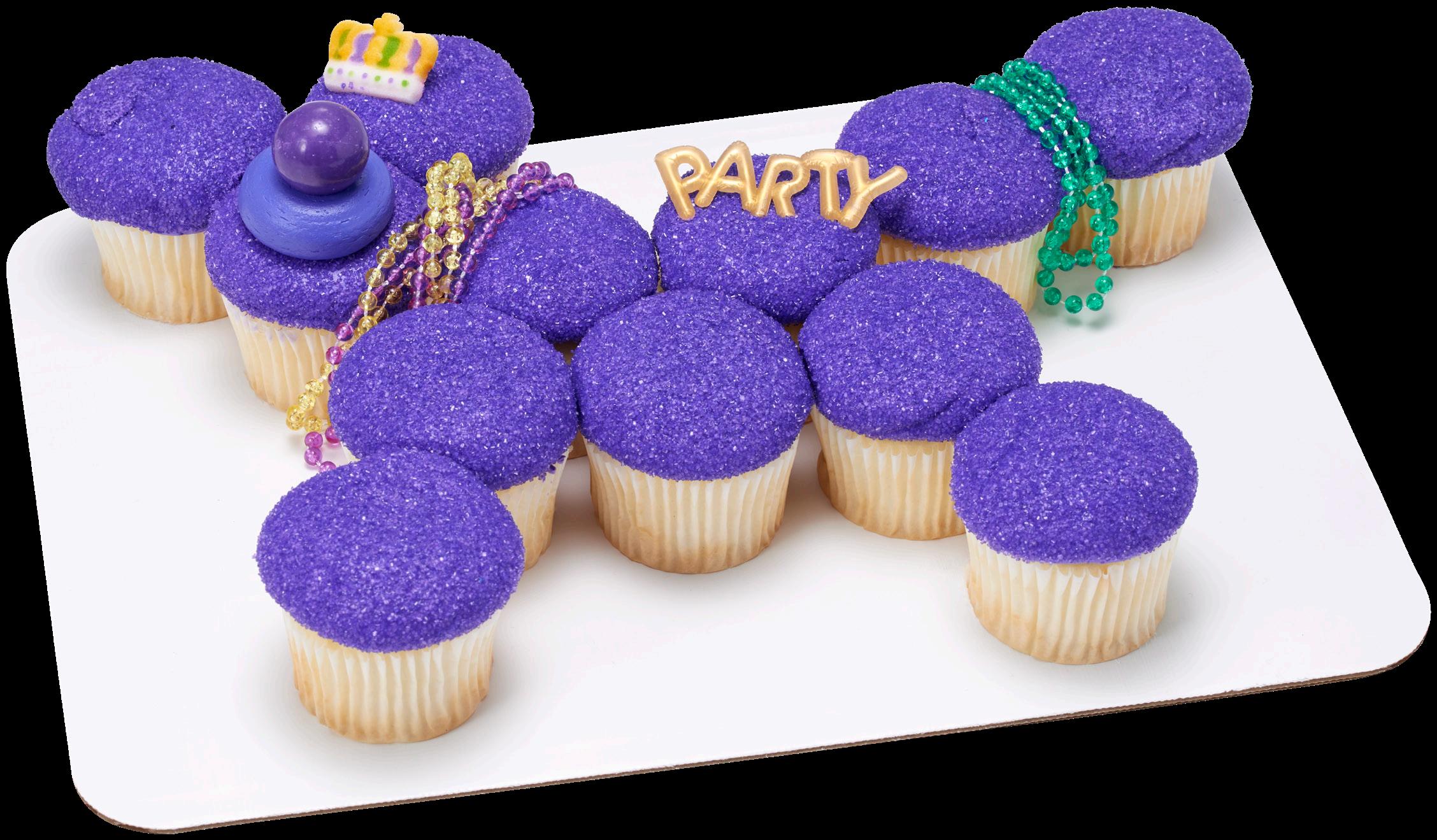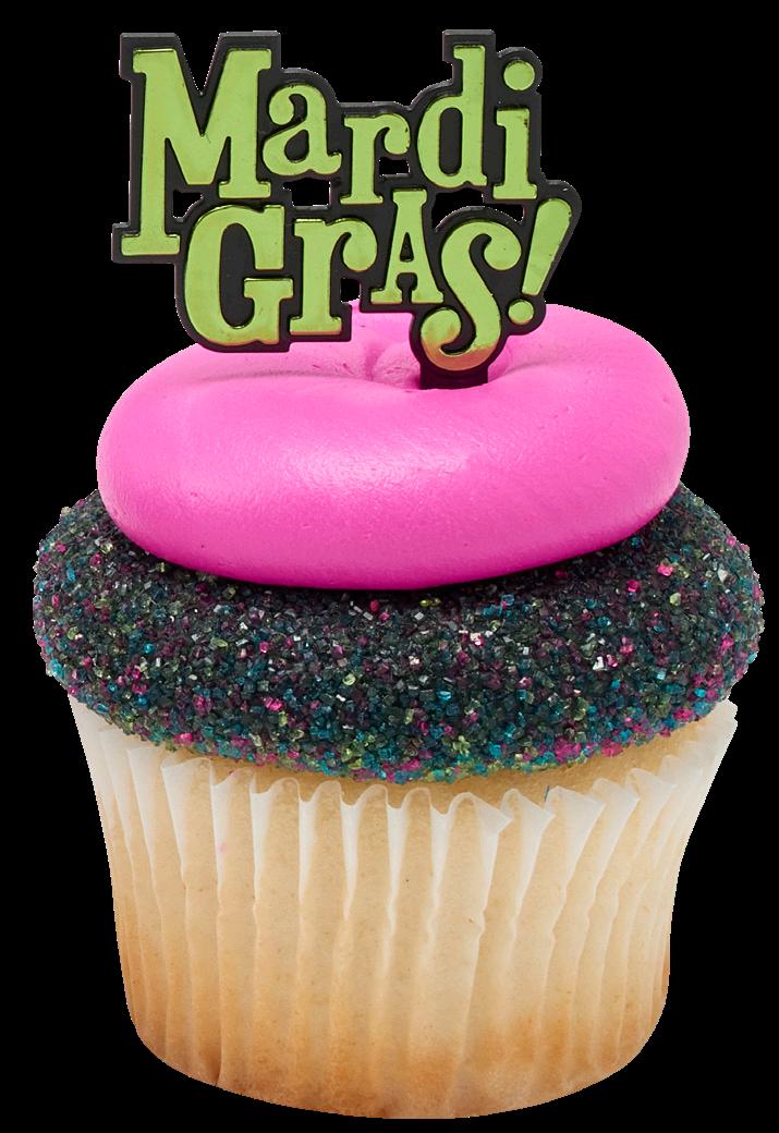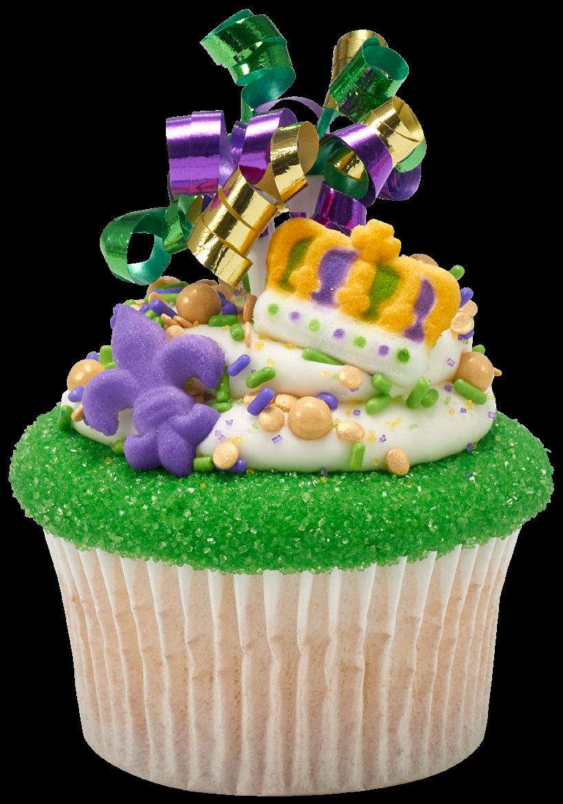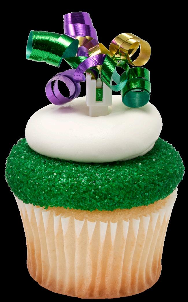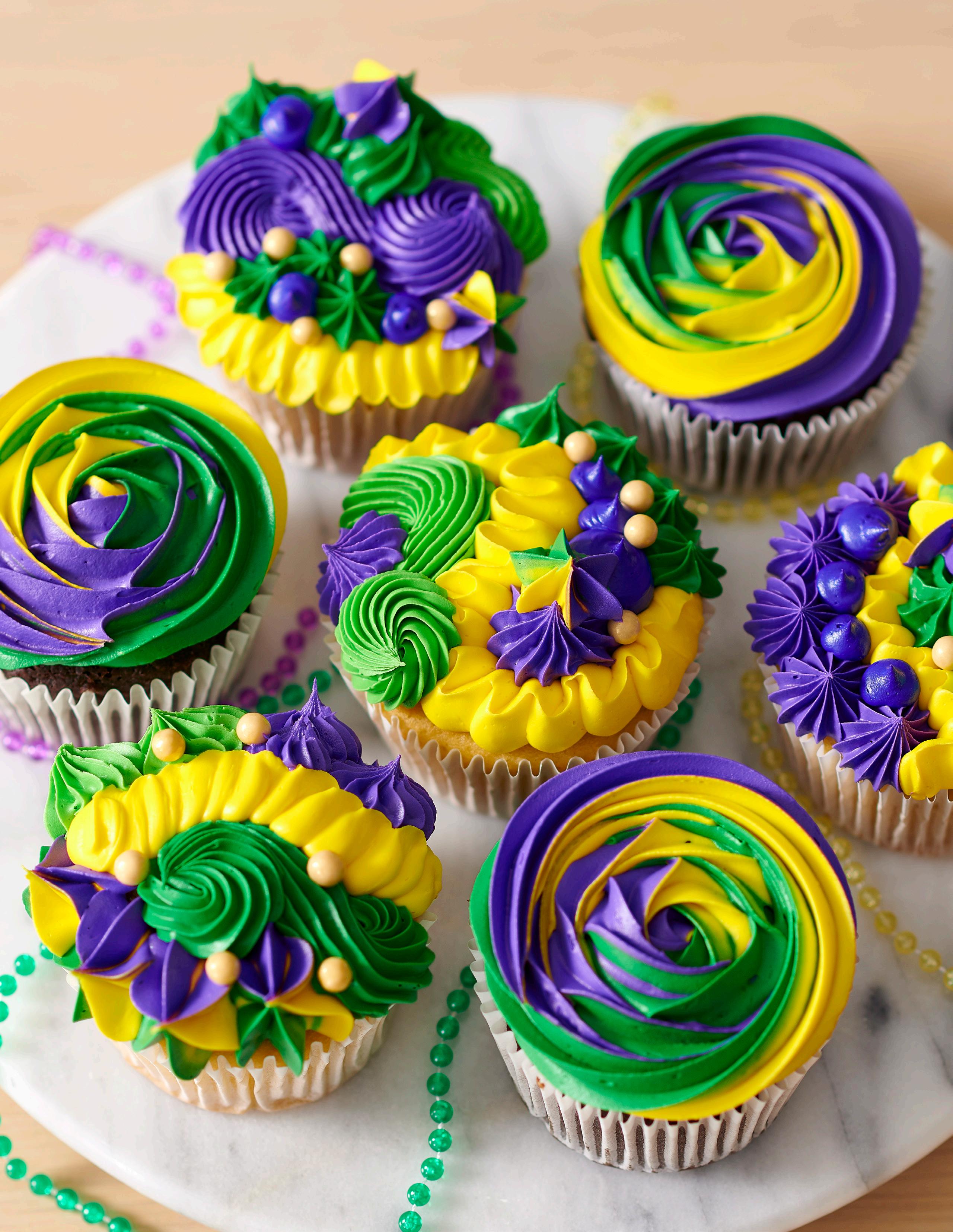 Shown on right cupcake: #48578 Mardi Gras Party Assortment Dec-Ons®, #8785/20689 Yellow Sanding Sugar, #9462/20690 Lavender Sanding Sugar, and #10380/21054 Lime Green Sanding Sugar