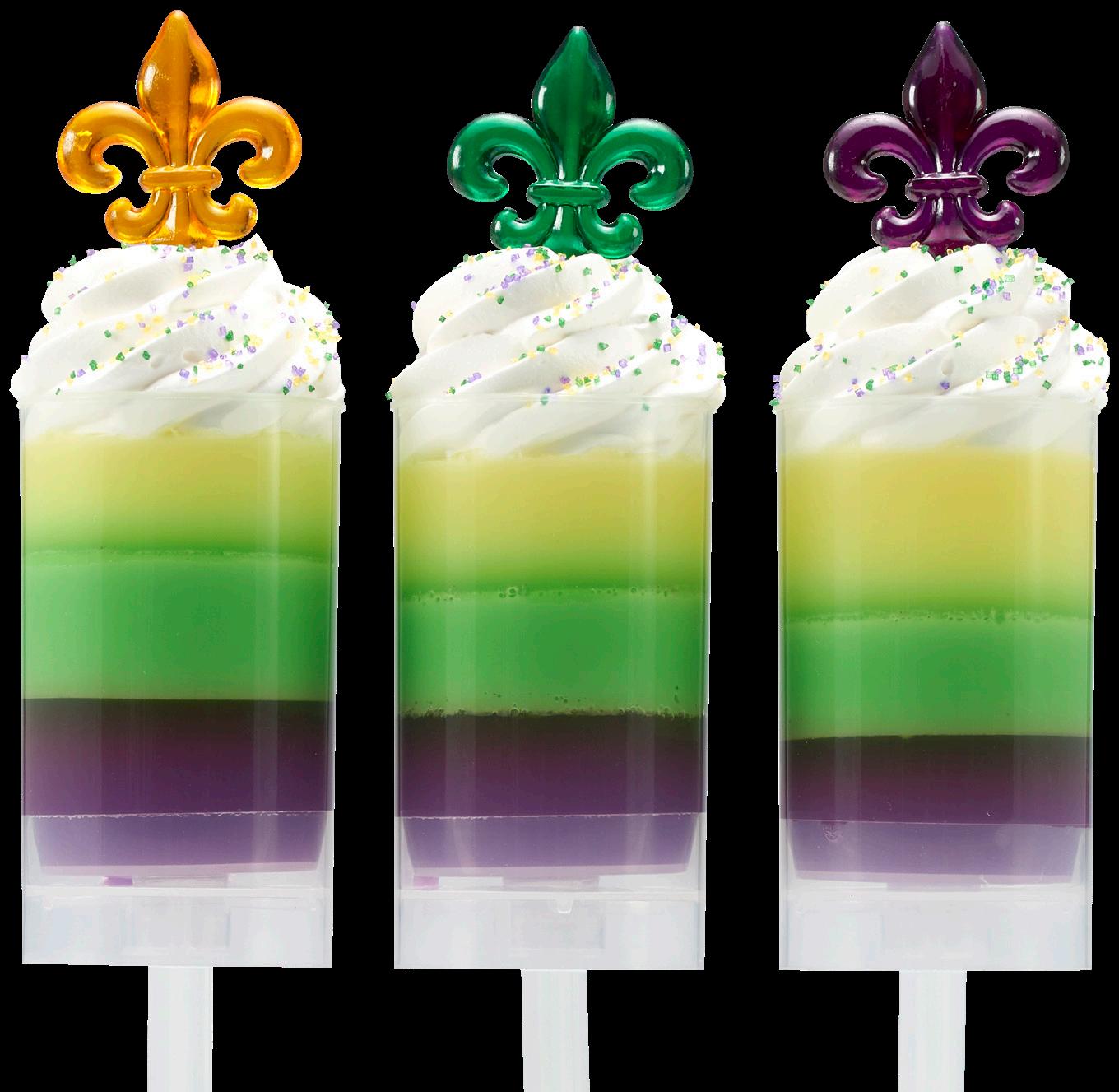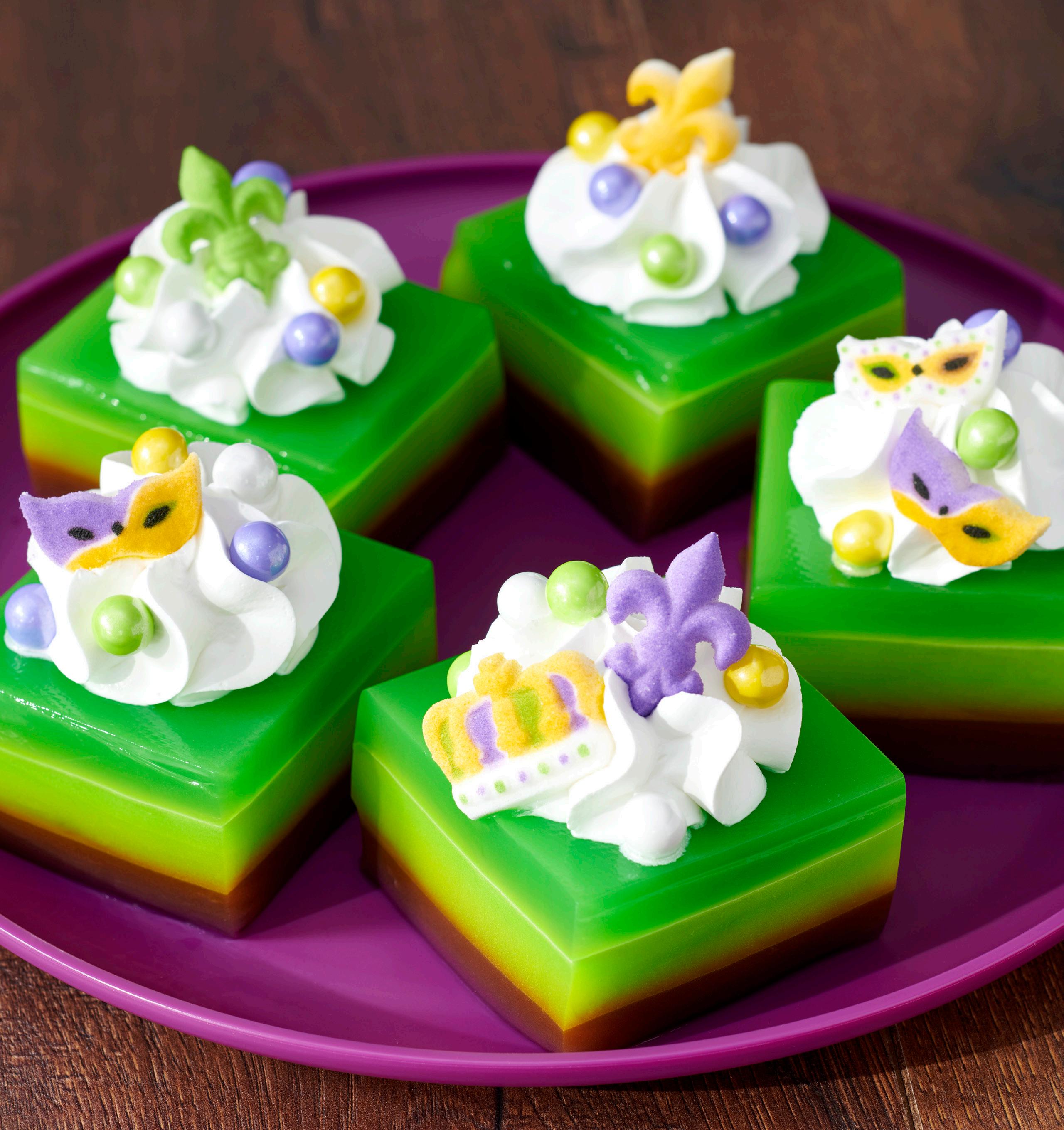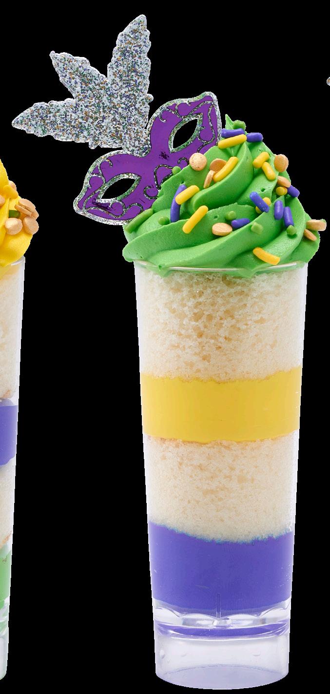 Shown: #24739 Mardi Gras Celebration Rings, #38133 Star Gold Edible Glitter, #39203 Amethyst Edible Glitter, #39206 Green Edible Glitter, and #24801 4” Black/Gold Reversible Cake Board Shown: #38854 Fleur de Lis Translucent DecoPics® and #48578 Mardi Gras Party Assortment Dec-Ons® Shown: #24738 Mardi Gras Masks Pop Tops®, #27697 Celebration Wishes Deluxe Fusion Mix, #20699/10381 Lime Green Sprinkles, #20698/11004 Lavender Sprinkles, and #18722 Star Plunger Cutters Key Bakery Dates Mardi Gras is: Tuesday, February 21 st Set in store: Wednesday, February 1 st 4 Pecan Pies 3 Popcorn Balls 5 Bundt Cakes