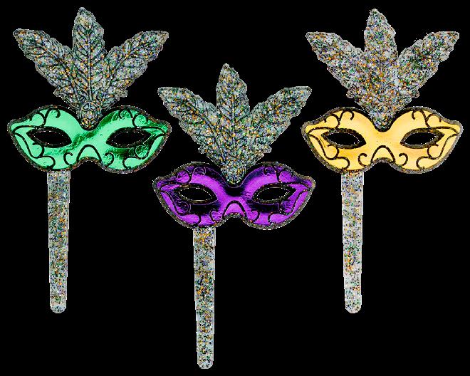 Shown: #24737 Mardi Gras Glitter Mask DecoPics®, #20699/10381 Lime Green Sprinkles, #20698/11004 Lavender Sprinkles, #20705/9464 Yellow Sprinkles, and #24048 Gold Confetti Quins