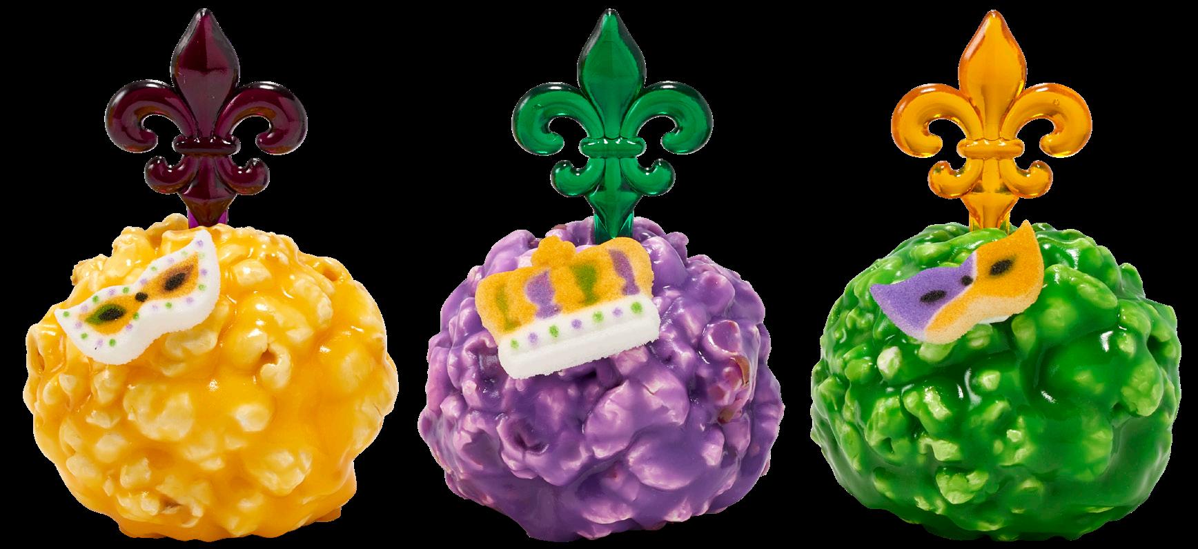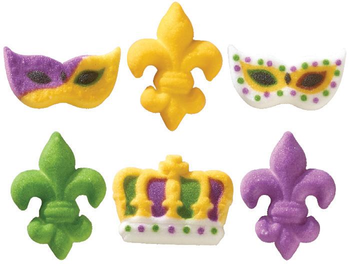 Shown: #41297 Mardi Gras Bead Necklace Layon, #16260 Baby Kings Cake Layon, #20690/9462 Lavender Sanding Sugar, and #20688/8782 Green Sanding Sugar, #20689/8785 Yellow Sanding Sugar