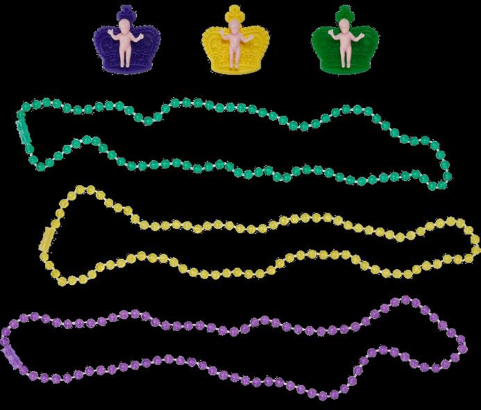 1-800-DECOPAC8 MARDI GRAS BABY CROWN NECKLACE SET #41269 Layon 72/Pkg – Necklace: 12” × 0.5” & Crown: 1.4” × 1.45” MARDI GRAS BEAD NECKLACE #41297 Layon 144/Pkg – 12” × 0.5” Layons Shown: #41297 Mardi Gras Bead Necklace Layon, #23865 Gold Balloon Words Mini Cupcake Layon, #48578 Mardi Gras Party Assortment Dec-Ons®, #26011 Primary Assortment Bubble Gum, and #20690/9462 Lavender Sanding Sugar Shown: #41269 Mardi Gras Baby Crown Necklace Set Layon
