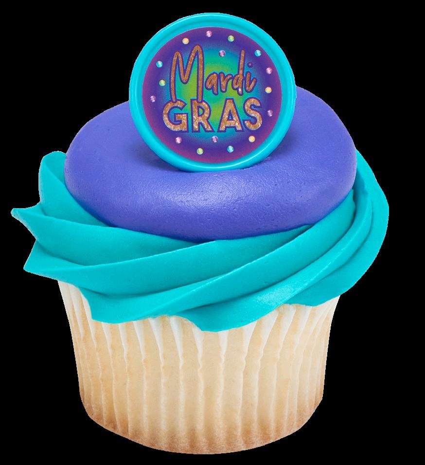 Shown on right cupcake: #48578 Mardi Gras Party Assortment Dec-Ons®, #8785/20689 Yellow Sanding Sugar, #9462/20690 Lavender Sanding Sugar, and #10380/21054 Lime Green Sanding Sugar