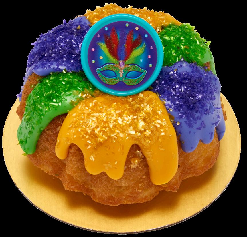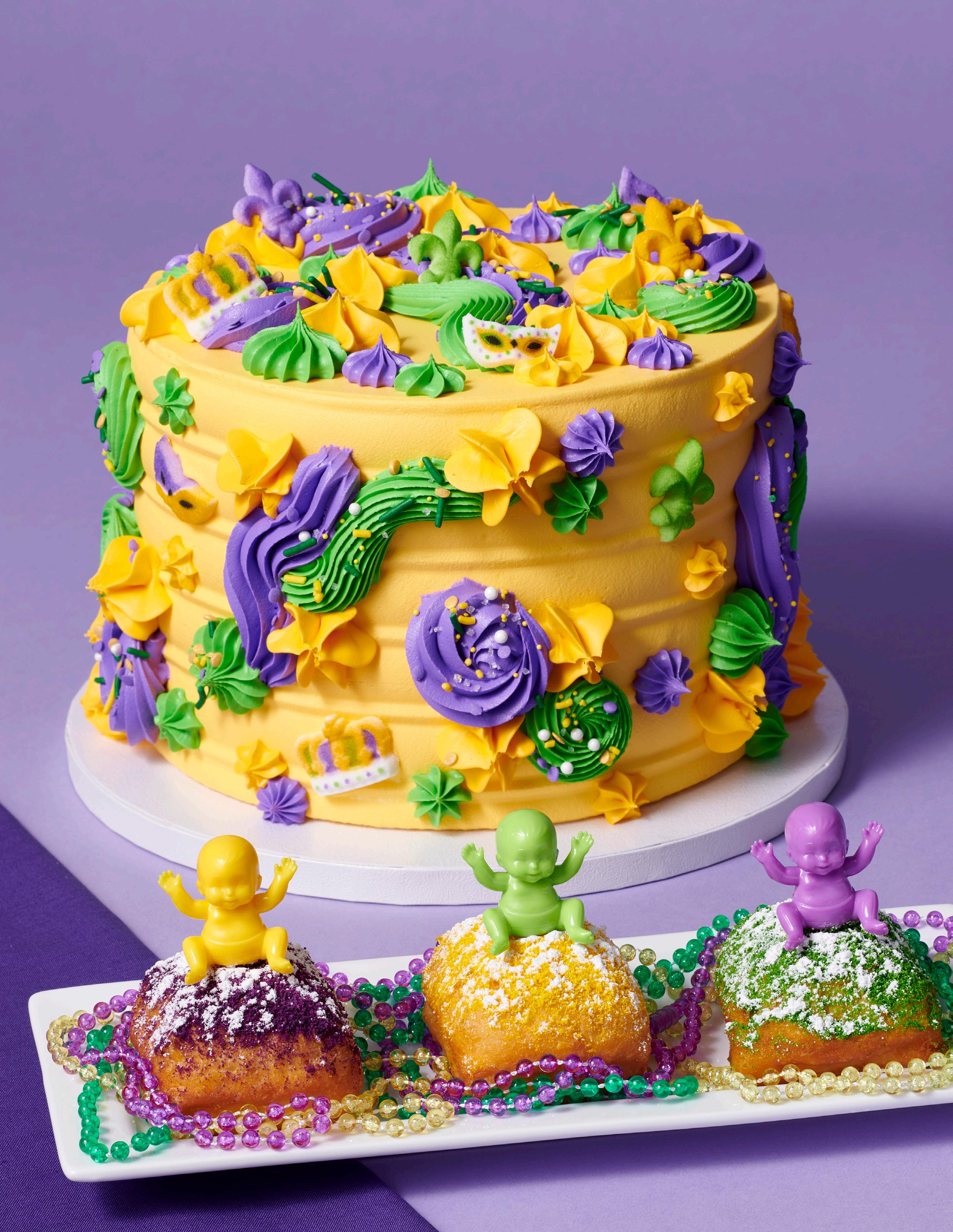 Shown on cover: 8” triple layer round: #48578 Mardi Gras Party Assortment Dec-Ons® and #29116 Mardi Gras Deluxe Fusion Mix Beignets: #29117 Kings Cake Baby Assortment Layon and #41297 Mardi Gras Bead Necklace Layon