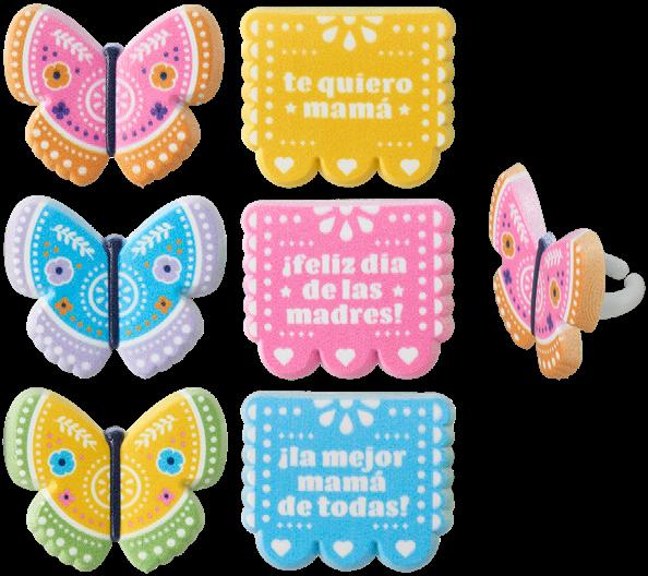 Shown: on previous page: on pink fudge: on 6” double layer square: #28478 ¡Feliz Día De Las Madres! Layon, #28422 Talavera Inspired Pattern PhotoCake® Edible Image® Strips; on cupcakes: #28460 ¡La Mejor Mamá de Todas! Rings, #21345/12462 White Nonpareils, and #21351/18200 White Pearl Grande Nonpareils; on cookies: #28421 ¡La Mejor Mamá de Todas! PhotoCake® Edible Image®, #44623 Premium 3” PhotoCake® Edible Circles, and #9784 Round Assorted Sizes Cutters
