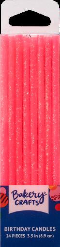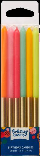 Full of sparkle, this assortment of candles can add shine to the top of any cake. Each package contains one purple, one pink, two green, and two blue.